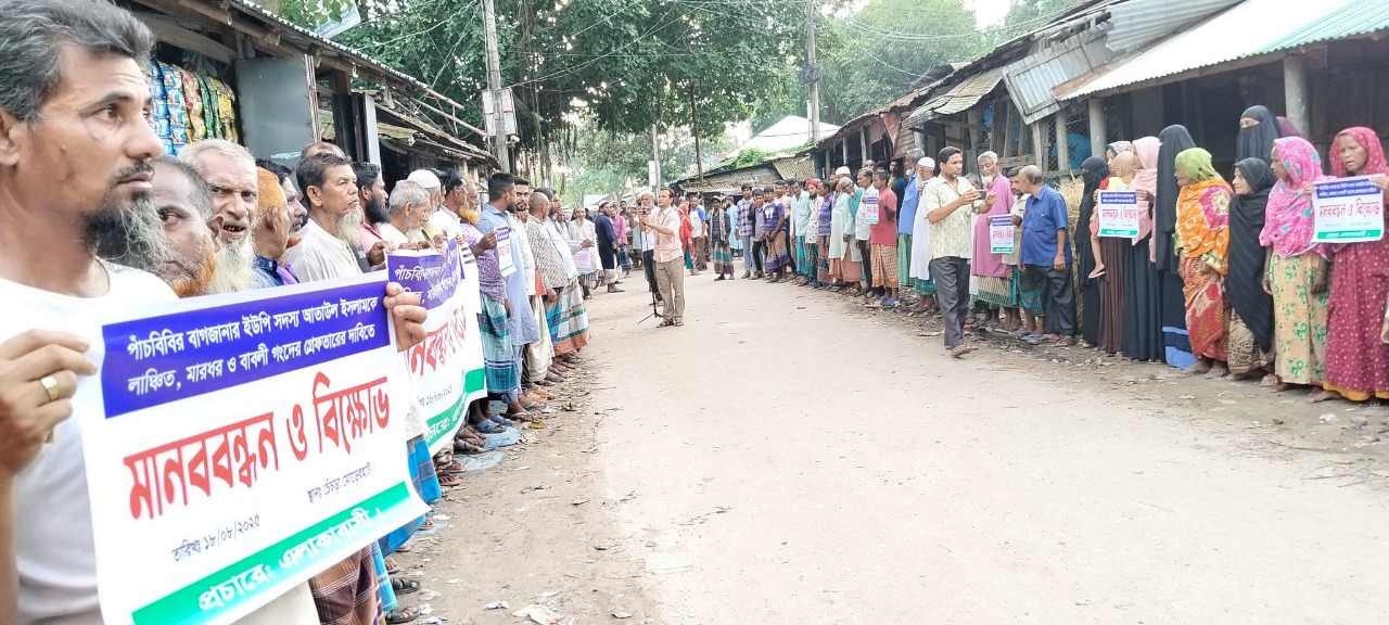 আল আমিন, জয়পুরহাট সোমবার, ১৮ আগস্ট ২০২৫ জয়পুরহাটের পাঁচবিবি উপজেলার বাগজানা ইউনিয়ন পরিষদের পাঁচবার নির্বাচিত সদস্য আতাউল ইসলামকে লাঞ্ছিত ও মারধরের প্রতিবাদে মানববন্ধন ও বিক্ষোভ মিছিল অনুষ্ঠিত হয়েছে। সোমবার বিকেলে উপজেলার চৌমুহনী বাজার মোড়ে স্থানীয় এলাকাবাসীর আয়োজনে ঘণ্টাব্যাপী মানববন্ধন কর্মসূচি পালিত হয়। মানববন্ধনে বক্তব্য রাখেন—লাঞ্ছিত ইউপি সদস্য আতাউল ইসলাম, স্থানীয় বাসিন্দা মাসুদ রানা ও নাঈমুর রহমান, ইউপি সদস্যপুত্র ইঞ্জিনিয়ার আবু সুফিয়ান, গৃহবধূ আনজুয়ারা এবং তাসলিমা বেগম। বক্তারা ইউপি সদস্যকে মারধরের ঘটনায় তীব্র নিন্দা জানিয়ে দ্রুত দোষীদের গ্রেফতার ও দৃষ্টান্তমূলক শাস্তির দাবি জানান। মানববন্ধন শেষে শত শত নারী-পুরুষের অংশগ্রহণে একটি বিক্ষোভ মিছিল বের হয়ে চৌমুহনী বাজারের প্রধান প্রধান সড়ক প্রদক্ষিণ করে। উল্লেখ্য, গত ৭ আগস্ট বৃহস্পতিবার সন্ধ্যায় চৌমুহনী বাজারের বাবুর চায়ের দোকানে অবস্থানকালে স্থানীয় বাবলি গং অতর্কিতভাবে আতাউল ইসলাম মেম্বারকে মারধর ও লাঞ্ছিত করে।