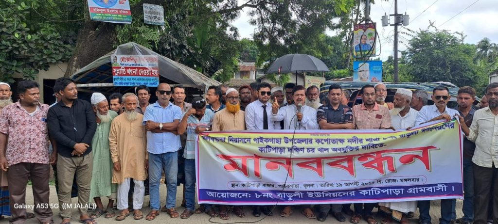 পাইকগাছায় কপোতাক্ষ নদের শাখা কাঠিপাড়া দক্ষিণ চর খাল উম্মুক্ত করার দাবিতে এলাকাবাসীর উদ্যোগে মানববন্ধন অনুষ্ঠিত হয়েছে। মঙ্গলবার (১৯ আগষ্ট) সকালে কাঠিপাড়া বাজারে মেইন সড়কে এ মানববন্ধন অনুষ্ঠিত হয়।