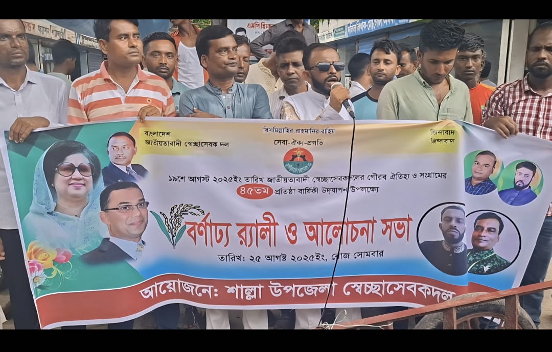 তৌফিকুর রহমান তাহের ; সুনামগঞ্জের শাল্লায় স্বেচ্ছাসেবক দলের আয়োজনে সোমবার ২৫ আগস্ট ৪৫ তম প্রতিষ্ঠা বার্ষিকী উদযাপন করা হয়েছে। জাতীয়তাবাদী স্বেচ্ছাসেবক দলের প্রতিষ্ঠাবার্ষিকী উপলক্ষে দলটির