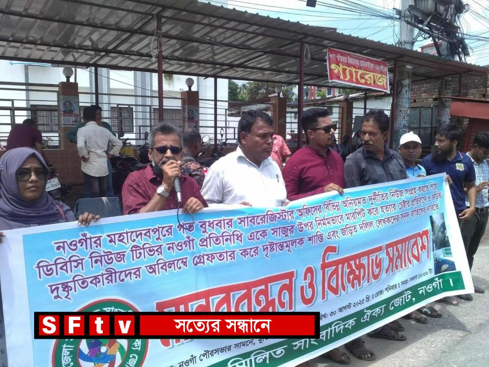 নওগাঁর মহাদেবপুর সাবরেজিস্ট্রি অফিসে তথ্য সংগ্রহ করতে গিয়ে ডিবিসি নিউজের নওগাঁ জেলা প্রতিনিধি সাংবাদিক এ কে সাজুর উপর হওয়া সন্ত্রাসী হামলার প্রতিবাদে নওগাঁয় মানববন্ধন ও বিক্ষোভ সমাবেশ অনুষ্ঠিত হয়েছে।