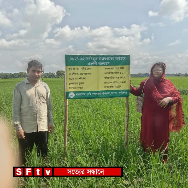 ফরিদপুরের সালথা উপজেলার উপসহকারী কৃষি কর্মকর্তা রওশন সুলতানা মুন্নি , সালথা উপজেলার সোনাপুর ইউনিয়নের বিভিন্ন কৃষকদেরকে পরামর্শ দিতে প্রতিটা কৃষকদের কাছে গিয়ে পরামর্শ দিচ্ছেন, কিভাবে ধান চাষ করলে কৃষক লাভবান হবে, এ সময় ধান চাষী কৃষক সুমনের গুরুত্বপূর্ণ বক্তব্য দেয়া হলো ,এবং কৃষকদেরকে উপজেলা থেকে আদা চাষ করার জন্য যে সকল জিনিসপত্র প্রদান করেছিলেন তাহা সওজমিনে গিয়ে সেগুলো তিনি পরিদর্শন করেন এবং কৃষকদেরকে আদার বিষয়ও পরামর্শ দিয়েছেন, এ সময় আদা চাষীদের কৃষকদের সাথে কথা বলে জানতে পারা যায় যে আদা চাষ করেও অনেক লাভবান হওয়া যায়, এ বিষয়ে একজন কৃষক মোঃ কুবাদ শেখার কাছে জানতে চাইলে তিনি আমাদেরকে জানিয়েছেন তাকে পাঁচশো বস্তায় আদার চাষ করার জন্য উপজেলা কৃষি সম্প্রসারণ অধিদপ্তর থেকে দেয়া হয়েছে, তাকে আদা দেয়া হয়েছে সেখান থেকে নিজের প্রয়োজন মিটিয়ে তিনি বাজারজাত করতে পারবেন, আর একজন কৃষকের সঙ্গে কথা বলে জানা যায় সে জন্য আদা চাষ করে স্বাবলম্বী হয়েছেন, এ বিষয়ে কৃষি কর্মকর্তা জানান আমরা বিনামূল্যে আদা সার কীটনাশকসহ সবকিছু কৃষকদের মাঝে বিনামূল্যে প্রদান করেছি, এ সময় কৃষি কর্মকর্তা একটি ধান ক্ষেত পরিদর্শন করেন, এই কৃষককে উপজেলার পক্ষ থেকে ধানের বীজ দেয়া হয়েছে তার সঙ্গে কথা বললে তিনি জানান আমরা ধান চাষ করে