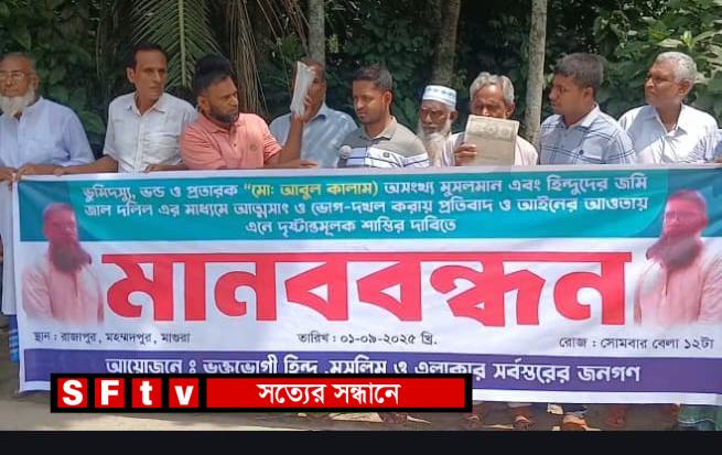 মাগুরার মহম্মদপুর উপজেলার রাজাপুর ইউনিয়নের গবরনাদা গ্রামে ভুয়া দলিলের মাধ্যমে জমি দখলের চেষ্টার প্রতিবাদে মানববন্ধন অনুষ্ঠিত হয়েছে। সোমবার সকাল ১১টায় রাজাপুর বাজার কামারবাড়ি মোড়ে ভুক্তভোগী পরিবার ও এলাকাবাসী এ মানববন্ধনের আয়োজন করেন।