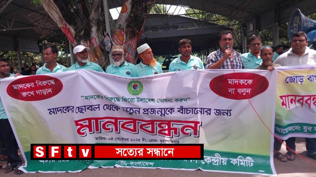 চাঁপাইনবাবগঞ্জ পৌর এলাকার চাঁন্দলাই জোড়বাগান বস্তি এলাকায় মাদকের ভয়াবহ ছোবল,মাদক বিক্রি , সেবনকারীদের বিরুদ্ধে মানববন্ধন করেছে চাঁন্দলাই জোড়বাগান এলাকার যুবসমাজ। বৃহস্পতিবার সকাল সাড়ে ১০ টায় জেলা প্রশাসকের কার্যালয়ের সামনে এ মানববন্ধন কর্মসূচি অনুষ্ঠিত হয়।