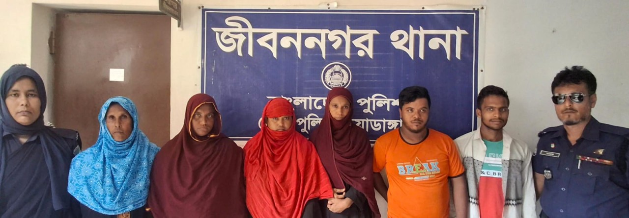 গ্রেফতারকৃতরা হলেন—গঙ্গাদাসপুর গ্রামের জুনায়েদ হোসেন জনি (২৬), পিতা মেহেদী হাসান টিপু, মাতা শিরিন শিলা।কাশীপুর ব্রিজের নিকট এলাকার মোঃ বিপ্লব (৩০), পিতা মোঃ কামাল।কুলতলা গ্রামের শাকিলা আক্তার পাখি (৪৪), স্বামী জিয়ারুল সরদার।কাশিপুর গ্রামের সাহিদা খাতুন (৫২), স্বামী মোশারেফ মিয়া।কুলতলা গ্রামের শিউলী খাতুন (৩৭), স্বামী আনারুল সরদার।কাশিপুর গ্রামের জেসমিন আক্তার (৩৮), স্বামী তুহিন ইসলাম। গ্রেফতারকৃত আসামিদের নিজ নিজ বাড়ি থেকে আটক করে যথাযথ পুলিশ স্কটের মাধ্যমে বিজ্ঞ আদালতে সোপর্দ করা হয়েছে।