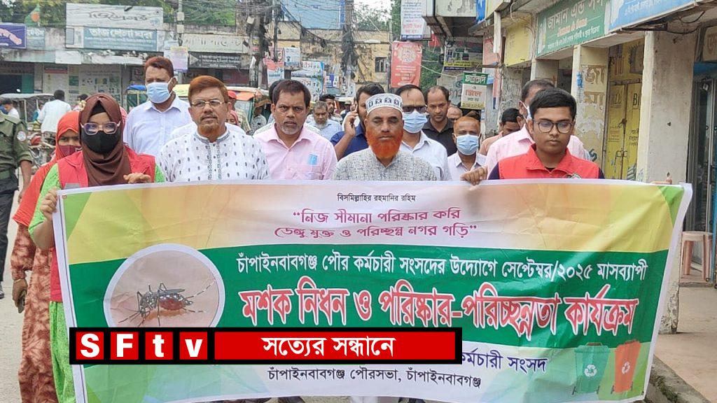 চাঁপাইনবাবগঞ্জ পৌরসভায় পৌর কর্মচারী সংসদের উদ্যোগে ১৭ই সেপ্টেম্বর রোজ বুধবার সকাল ১০ ঘটিকায় পৌর চত্তর থেকে মশক নিধন ও পরিষ্কার-পরিচ্ছন্নতা কার্যক্রম বাস্তবায়নে পৌরসভার প্রধান প্রধান সড়কে র্যালি ও লিফলেট বিতরণ করেন। চাঁপাইনবাবগঞ্জ পৌরসভার এই মহৎ কার্যক্রম উদ্বোধন করেন চাঁপাইনবাবগঞ্জ পৌরসভার নির্বাহী প্রকৌশলী মোঃ তৌফিকুল আলম। উক্ত র্যালিতে “নিজ সীমানা পরিষ্কার করি,ডেঙ্গু মুক্ত ও পরিচ্ছন্ন নগর গড়ি” স্লোগানের মধ্য দিয়ে আশেপাশে সকল জনগণের হাতে লিফলেট তুলে দেন পৌর কর্মচারী সংসদ। র্যালি শেষে পৌরসভায় হলরুমে আলোচনা সভার আয়োজন করেন চাঁপাইনবাবগঞ্জ পৌরসভার পৌর কর্মচারী সংসদ। উক্ত আলোচনা সভায় সভাপতিত্ব করেন চাঁপাইনবাবগঞ্জ পৌরসভার পৌর কর্মচারী সংসদের সভাপতি মোঃ এনামুল হক। উক্ত আলোচনা সভায় প্রধান অতিথি হিসেবে ছিলেন চাঁপাইনবাবগঞ্জ পৌরসভার নির্বাহী প্রকৌশলী মোঃ তৌফিকুর ইসলাম। প্রধান অতিথি বক্তব্য দেন, চাঁপাইনবাবগঞ্জ পৌরসভার পৌর কর্মচারী সংসদের পক্ষ থেকে মাসব্যাপী পরিষ্কার- পরিচ্ছন্নতা ও বর্জ্য অপসারণ কাজ সহ ডেঙ্গু নিধন কার্যক্রম (ক্রাস প্রোগাম) শুরু হয়েছে। আমাদের সকলের দায়িত্ব পৌরসভাকে সুন্দর রাখা এবং স্বাস্থ্যকর পরিবেশ বজায় রাখা। চাঁপাইনবাবগঞ্জ পৌরবাসীর কাছে সহযোগিতা চেয়েছেন। উক্ত অনুষ্ঠানে আরোও উপস্থিতবর্গ বক্তব্য রাখেন,চাঁপাইনবাবগঞ্জ পৌরসভার পৌর কর্মচারী সংসদের সাধারণ সম্পাদক আব্দুল আজিজ খান, চাঁপাইনবাবগঞ্জ পৌরসভার পৌর নির্বাহী কর্মকর্তা মামুন- অর- রশীদ,চাঁপাইনবাবগঞ্জ পৌরসভা হিসাব রক্ষক কর্মকর্তা মোঃ আহসান হাবিব,চাঁপাইনবাবগঞ্জ পৌরসভা সেনেটারী ইন্সপেক্টর মোঃ গোলাম ফারুক চাঁপাইনবাবগঞ্জ পৌরসভার কনজারবেন্সী ইন্সপেক্টর মোঃ রোজিবুল হক সহ উপস্থিত ছিলেন সকল চাঁপাইনবাবগঞ্জ পৌর- কর্মচারী সংসদ।