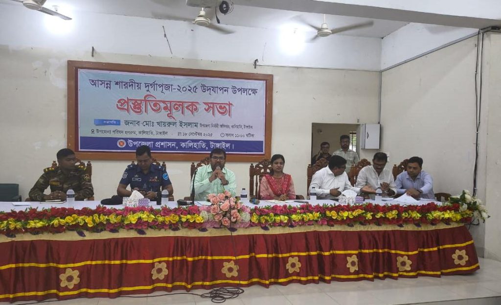 শুভ্র মজুমদার, কালিহাতী টাঙ্গাইলের কালিহাতীতে আসন্ন শারদীয় দুর্গাপূজা সুষ্ঠুভাবে উদযাপনের লক্ষ্যে প্রস্তুতিমূলক সভা অনুষ্ঠিত হয়েছে। বৃহস্পতিবার (১৮ সেপ্টেম্বর) উপজেলা পরিষদ হলরুমে এই সভার আয়োজন করা হয়। সভায় সভাপতিত্ব করেন উপজেলা নির্বাহী অফিসার মো. খায়রুল ইসলাম। এতে উপস্থিত ছিলেন কালিহাতী আর্মি ক্যাম্পের কমান্ডার লে. ইশতিয়াক হোসেন নাসিফ, উপজেলা সহকারী কমিশনার (ভূমি) সায়েদা খানম লিজা, কালিহাতী থানার অফিসার ইনচার্জ (ওসি) মাহবুবুর রহমান, উপজেলা পূজা উদযাপন পরিষদের আহ্বায়ক প্রদীপ ব্যানার্জী নীরু, সদস্য সচিব প্রবাল ভট্টাচার্য মানিকসহ বিভিন্ন রাজনৈতিক দলের নেতা, শিক্ষক, সরকারি কর্মকর্তা ও হিন্দু সম্প্রদায়ের নেতৃবৃন্দ।
