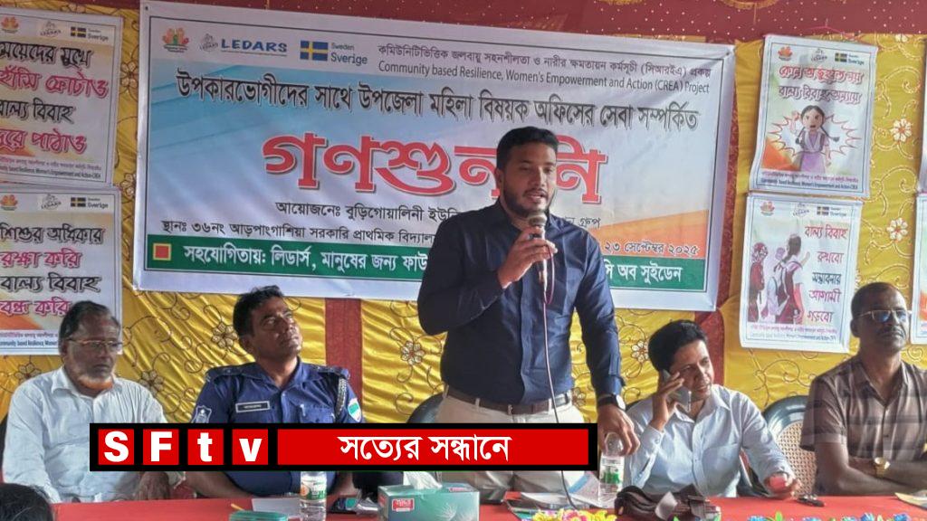 শ্যামনগর উপজেলার বুড়িগোয়ালিনী ইউনিয়ন ক্লাইমেট এ্যাকশন গ্রুপের আয়োজনে লিডার্স, মানুষের জন্য ফাউন্ডেশন ও এ্যাম্বাসি অব সুইডেনের সহযোগিতায় কমিউনিটি ভিত্তিক জলবায়ু সহনশীলতা ও নারীর ক্ষমতায়ন কর্মসূচি (সিআরইএ) প্রকল্পের আওতায় বুড়িগোয়ালিনী ইউনিয়নের ৩৬নং আড়পাংগাশিয়া সরকারী প্রাথমিক বিদ্যালয়ের সাইক্লোন শেল্টার প্রাঙ্গণে মঙ্গলবার (২৩ সেপ্টেম্বর ২০২৫) গণশুনানির আয়োজন করেন।