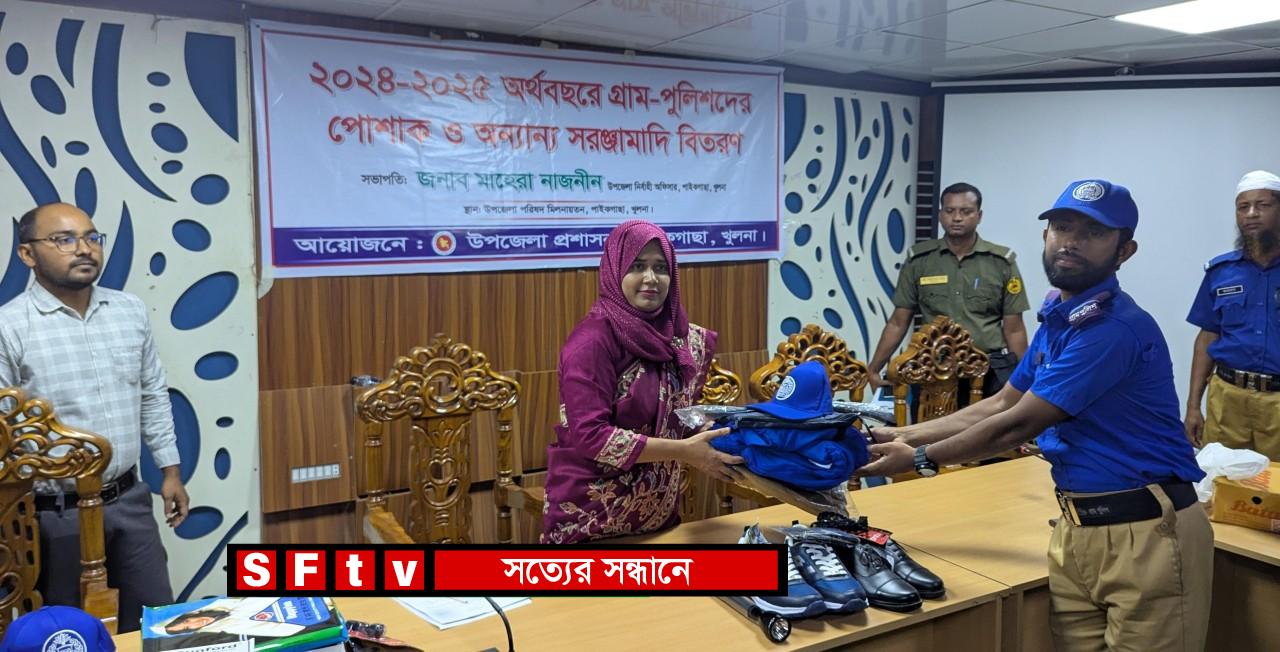 ২০২৪-২৫ অর্থবছরে সরকারের রাজস্ব খাতের বরাদ্দ থেকে পাইকগাছা উপজেলার গ্রাম পুলিশদের মাঝে পোশাক ও বিভিন্ন সরঞ্জামাদি বিতরণ করা হয়েছে। বুধবার (২৪ সেপ্টেম্বর ) দুপুর ১টায় উপজেলা পরিষদ মিলনায়তনে উপজেলা প্রশাসনের আয়োজনে এ অনুষ্ঠান অনুষ্ঠিত হয়। অনুষ্ঠানে সভাপতিত্ব করেন উপজেলা নির্বাহী অফিসার মাহেরা নাজনীন। তিনি বলেন, গ্রাম পুলিশরা স্থানীয় নিরাপত্তা, আইনশৃঙ্খলা রক্ষা ও জননিরাপত্তায় গুরুত্বপূর্ণ ভূমিকা পালন করে আসছেন। তাদের দায়িত্ব আরও সুষ্ঠুভাবে পালনের সুবিধার্থে সরকার প্রতিবছর পোশাক ও প্রয়োজনীয় সরঞ্জামাদি বিতরণ করে থাকে। অনুষ্ঠানে উপস্থিত ছিলেন ইউপি চেয়ারম্যান গাজী আব্দুস সালাম কেরু, বাবু রিপন কুমার মন্ডল, ভারপ্রাপ্ত চেয়ারম্যান মোঃ জাহাঙ্গীর আলম সানা, মোঃ ইউনুছ আলী, মোঃ আবুল হাসেম, মোঃ খোরশেদুজ্জামান,পীযুষ মন্ডল, প্রেসক্লাব পাইকগাছার সাধারণ সম্পাদক এম. জালাল উদ্দিন, অফিস সহকারী সুরজিত পাল সহ উপজেলার ১০ ইউনিয়নের দফাদার ও চৌকিদার বৃন্দ। এসময়ে উপজেলা নির্বাহী অফিসার মাহেরা নাজনীন (১৮ প্রকারের) পোশাক ও সরঞ্জামাদি গ্রাম পুলিশদের হাতে তুলে দেন। এর মধ্যে ছিল– প্যান্ট, শার্ট, জুতা, বেল্ট, ক্যাপ, শীতবস্ত্র, ছাতা,বেতের লাঠি, রেইনকোটসহ বিভিন্ন উপকরণ। সরঞ্জাম গ্রহণ শেষে গ্রাম পুলিশের সদস্যরা সরকার ও স্থানীয় প্রশাসনের প্রতি কৃতজ্ঞতা প্রকাশ করেন। তারা বলেন, এসব সরঞ্জাম পেয়ে তারা দায়িত্ব পালনে আরও অনুপ্রাণিত হবেন।