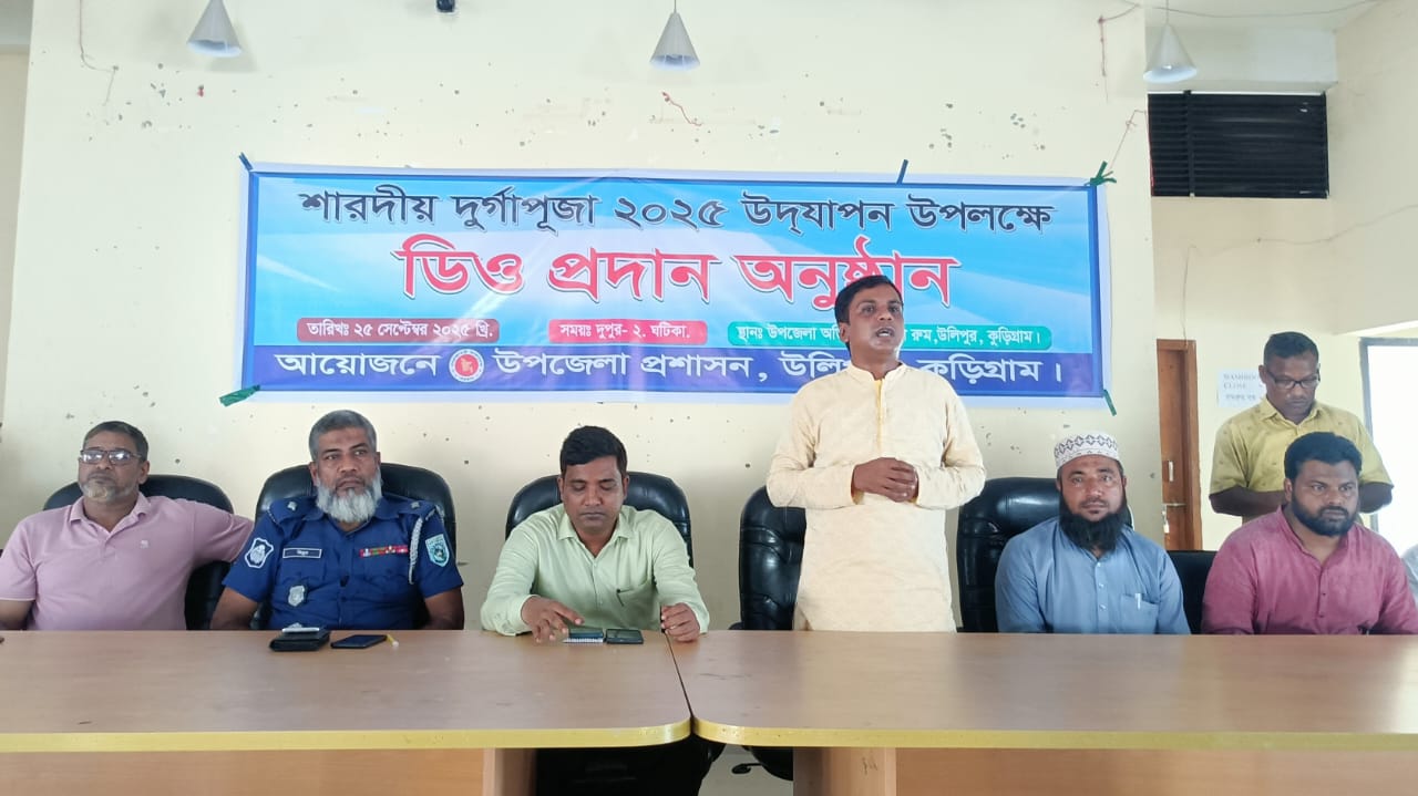 রফিকুল ইসলাম রফিক; কুড়িগ্রামের উলিপুরে শারদীয় দুর্গাপূজা–২০২৫ উদ্যাপন উপলক্ষে সরকারি অনুদানের ডিও (বিতরণী) প্রদান অনুষ্ঠান অনুষ্ঠিত হয়েছে। বৃহস্পতিবার (২৫ সেপ্টেম্বর ২০২৫) দুপুরে উপজেলা অডিটরিয়াম হলরুমে এ অনুষ্ঠান আয়োজন করে উপজেলা প্রশাসন। অনুষ্ঠানে প্রধান অতিথি হিসেবে উপস্থিত ছিলেন উপজেলা নির্বাহী কর্মকর্তা (ইউএনও) নয়ন কুমার সাহা। বিশেষ অতিথি হিসেবে উপস্থিত ছিলেন উলিপুর থানার অফিসার ইনচার্জ (ওসি) জিল্লুর রহমান, বাংলাদেশ পূজা উদযাপন ফ্রন্টের কুড়িগ্রাম জেলার সদস্য সচিব স্বপন কুমার সাহা, ইসলামি আন্দোলন বাংলাদেশের নেতা মোঃ আতাউর রহমান, গণঅধিকার পরিষদের নেতা তানভির শুভ, এনসিপির যুগ্ম মহাসচিব মোঃ শাখাওয়াত হোসেন, কুড়িগ্রাম জেলা কৃষকদলের যুগ্ম আহ্বায়ক ও সাবেক ছাত্রনেতা আবু জাফর সোহেল রানা এবং সাবেক ছাত্রনেতা ফিরোজ কবির কাজল প্রমুখ। বক্তারা বলেন, “ধর্ম যার যার, উৎসব সবার।” দুর্গাপূজা শান্তিপূর্ণভাবে সম্পন্ন করতে সরকার সবধরনের সহযোগিতা দিয়ে আসছে। সমবেত প্রচেষ্টাতেই সমাজে সম্প্রীতি ও শান্তি বজায় রাখা সম্ভব। অনুষ্ঠান শেষে উপজেলার বিভিন্ন পূজামণ্ডপের সভাপতি ও সাধারণ সম্পাদকদের হাতে সরকারি অনুদানের ডিও পত্র হস্তান্তর করা হয়। জানা গেছে, উলিপুর উপজেলায় মোট ১১২টি পূজামণ্ডপে এ অনুদান প্রদান করা হয়েছে। বক্তারা আরও বলেন, প্রতিটি পূজামণ্ডপ সিসি ক্যামেরার আওতায় থাকবে এবং আইন-শৃঙ্খলা বাহিনীসহ স্থানীয় প্রশাসন, রাজনৈতিক নেতা ও সাধারণ মানুষ পূজা নির্বিঘ্নে সম্পন্ন করার জন্য সর্বাত্মক সহযোগিতা প্রদান করবে।