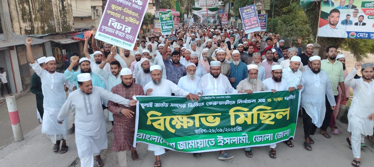 বাংলাদেশ জামায়াতে ইসলামী ভোলা জেলা শাখার উদ্যোগে ৫ দফা দাবিতে বিক্ষোভ মিছিল ও সমাবেশ অনুষ্ঠিত হয়েছে। শুক্রবার (২৬ সেপ্টেম্বর) দুপুরে শহরের কালীনাথ রায়ের বাজার থেকে মিছিলটি শুরু হয়ে বিভিন্ন সড়ক প্রদক্ষিণ শেষে বাংলা স্কুল মোড়ে গিয়ে সমাবেশে মিলিত হয়। দাবিগুলোর মধ্যে রয়েছে— পি আর পদ্ধতিতে নির্বাচন, লেভেল প্লেয়িং ফিল্ড নিশ্চিত করা, জুলাই সনদ প্রণয়ন, ফ্যাসিস্ট নির্যাতন-গণহত্যার বিচার এবং জাতীয় পার্টিসহ ১৪ দলের কার্যক্রম নিষিদ্ধকরণ। সমাবেশে বক্তব্য রাখেন জেলা জামায়াতের আমির মাস্টার জাকির হোসাইন, নায়েবে আমির ও ভোলা-১ আসনে মনোনীত সংসদ সদস্য প্রার্থী অধ্যক্ষ নজরুল ইসলাম, জেলা কর্মপরিষদ সদস্য ও মিডিয়া সম্পাদক অধ্যাপক আমির হোসেন, সদর উপজেলা আমির মাওলানা কামাল হোসেন ও পৌর আমির জামাল উদ্দিনসহ অন্যান্য নেতৃবৃন্দ। নেতৃবৃন্দ বলেন, “৫ আগস্ট ফ্যাসিস্ট শেখ হাসিনাকে ক্ষমতাচ্যুত করার পরও জনগণ প্রত্যাশিত সুফল পায়নি। তাই জনগণের অধিকার আদায়ে জামায়াত ৫ দফা দাবি নিয়ে আবারও রাজপথে নেমেছে।” তারা সরকারের প্রতি আহ্বান জানান, আগামী নির্বাচন অবশ্যই পিআর পদ্ধতিতে আয়োজন করতে হবে এবং জনগণের ন্যায্য দাবি পূরণে কার্যকর ব্যবস্থা নিতে হবে।