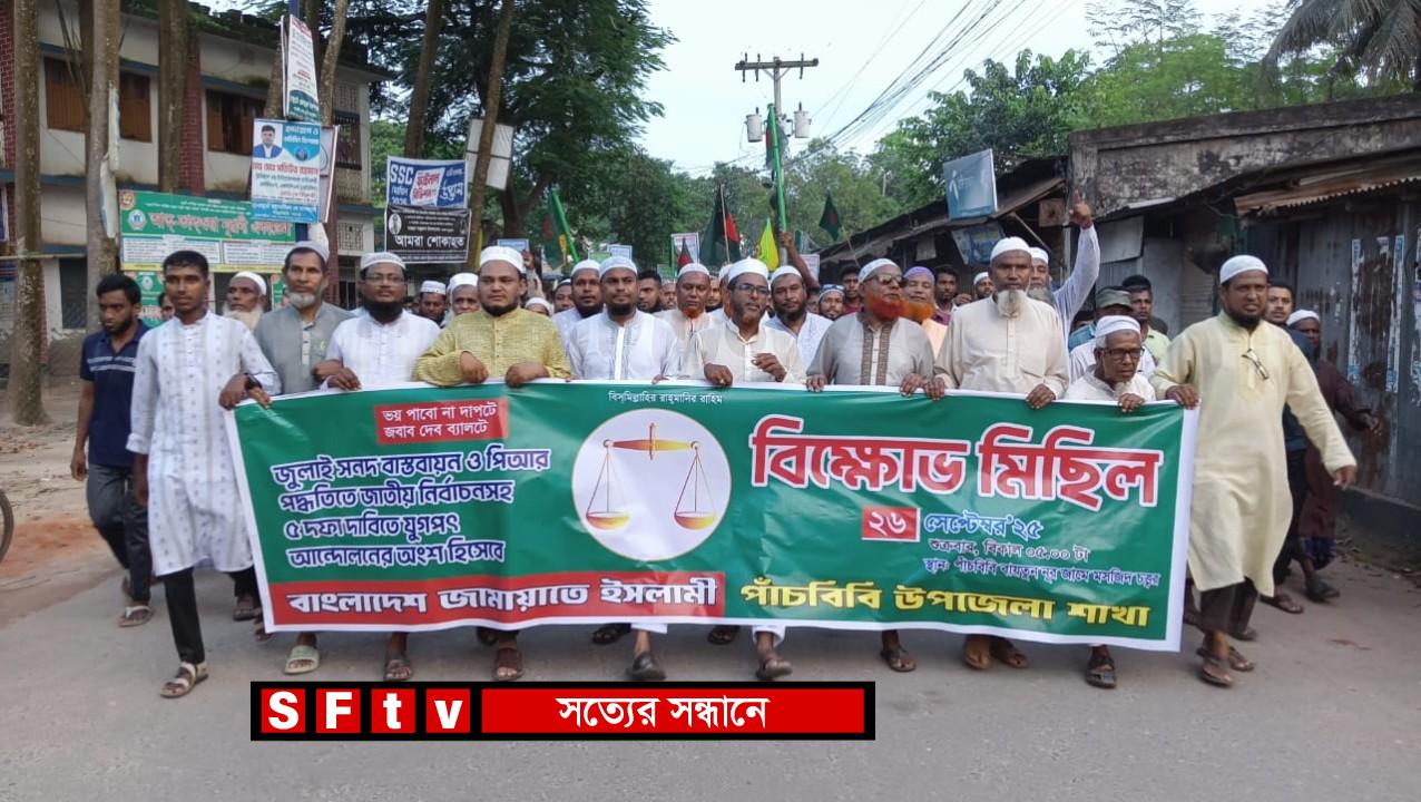 জয়পুরহাট জেলার পাঁচবিবি উপজেলা জামায়াতে ইসলামীর উদ্যোগে ২৬ শে সেপ্টেম্বর বিকাল ৫টায় পাঁচবিবি বায়তুন নুর জামে মসজিদ হতে বিক্ষোভ মিছিলটি বের করে শহরের গুরুত্বপূর্ণ সড়ক প্রদক্ষিণ করে। বিক্ষোভ মিছিলে পাঁচবিবি উপজেলার বিভিন্ন ইউনিয়ন থেকে পাঁচ হাজারের অধিক মানুষ অংশগ্রহণ করেন। বিক্ষোভ মিছিলে প্রধান অতিথি হিসেবে উপস্থিত ছিলেন জয়পুরহাট জেলা জামায়াতে ইসলামীর আমীর এবং জয়পুরহাট-১ (সদর-পাঁচবিবি) আসনের আসন্ন জাতীয় সংসদ নির্বাচনে জামায়াত মনোনীত সংসদ সদস্য প্রার্থী মজলুম জননেতা জনাব ফজলুর রহমান সাঈদ।
