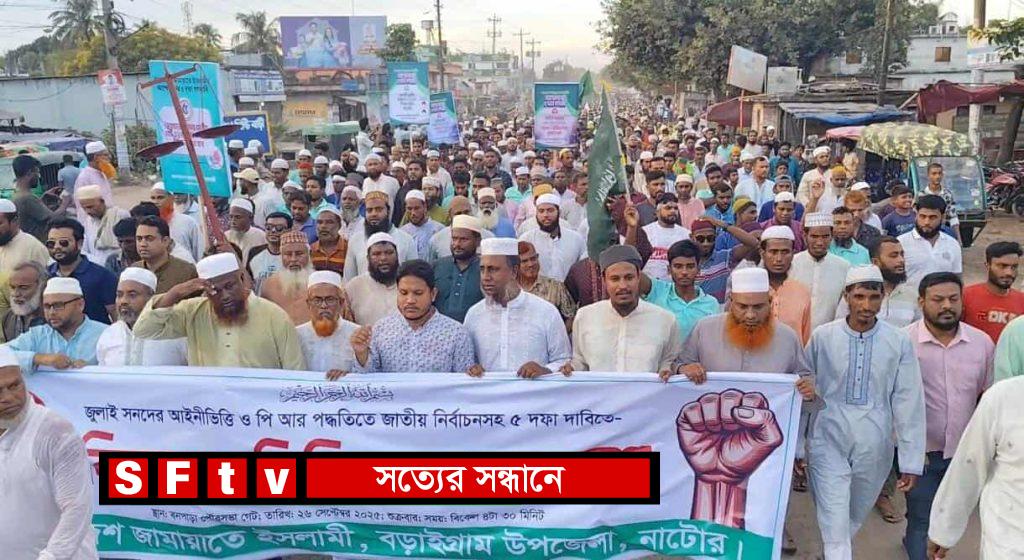 হাসান আলী সোহেল : নাটোরের বড়াইগ্রামে আগামী জাতীয় সংসদ নির্বাচন প্রোপোরশনাল রিপ্রেজেন্টেশন (পিআর) পদ্ধতিতে আয়োজন এবং ৫ দফা দাবির প্রেক্ষিতে বিক্ষোভ মিছিল ও সমাবেশ করেছে বাংলাদেশ জামায়াতে ইসলামী। শুক্রবার (২৬ সেপ্টেম্বর) বিকেলে কেন্দ্রীয় কর্মসূচির অংশ হিসেবে বনপাড়া পৌর গেইট থেকে মিছিলটি শুরু হয়ে প্রধান সড়ক প্রদক্ষিণ শেষে একই স্থানে সমাবেশে মিলিত হয়। সমাবেশে বক্তারা বলেন, “জুলাইতে প্রস্তাবিত জাতীয় সনদের ভিত্তিতে আগামী ফেব্রুয়ারিতে নির্বাচন দিতে হবে। পাশাপাশি সংসদের উভয় কক্ষে পিআর পদ্ধতি চালু, অবাধ ও সুষ্ঠু নির্বাচনের জন্য সমতল ক্ষেত্র (লেভেল প্লেয়িং ফিল্ড) নিশ্চিত, বর্তমান সরকারের গণহত্যা ও দুর্নীতির বিচারসহ ৫ দফা দাবি মেনে নিতে হবে।” সমাবেশে প্রধান অতিথি হিসেবে বক্তব্য রাখেন বাংলাদেশ জামায়াতে ইসলামীর সহকারী সেক্রেটারি ও নাটোর জেলা শাখার নেতা, নাটোর-৪ (গুরুদাসপুর vবড়াইগ্রাম) আসনের সংসদ সদস্য পদপ্রার্থী অধ্যাপক মাওলানা মো. আব্দুল হাকিম। তিনি বলেন, “দেশে যে একনায়কতন্ত্র কায়েম হয়েছে তা থেকে মুক্তি পেতে হলে জনগণের ভোটাধিকার ফিরিয়ে দিতে হবে। নিরপেক্ষ নির্বাচনের মাধ্যমেই জাতি মুক্তি পাবে। আমরা গণতন্ত্র ও আইনের শাস