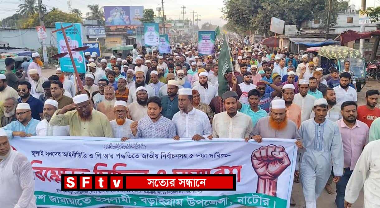 হাসান আলী সোহেল : নাটোরের বড়াইগ্রামে আগামী জাতীয় সংসদ নির্বাচন প্রোপোরশনাল রিপ্রেজেন্টেশন (পিআর) পদ্ধতিতে আয়োজন এবং ৫ দফা দাবির প্রেক্ষিতে বিক্ষোভ মিছিল ও সমাবেশ করেছে বাংলাদেশ জামায়াতে ইসলামী। শুক্রবার (২৬ সেপ্টেম্বর) বিকেলে কেন্দ্রীয় কর্মসূচির অংশ হিসেবে বনপাড়া পৌর গেইট থেকে মিছিলটি শুরু হয়ে প্রধান সড়ক প্রদক্ষিণ শেষে একই স্থানে সমাবেশে মিলিত হয়। সমাবেশে বক্তারা বলেন, "জুলাইতে প্রস্তাবিত জাতীয় সনদের ভিত্তিতে আগামী ফেব্রুয়ারিতে নির্বাচন দিতে হবে। পাশাপাশি সংসদের উভয় কক্ষে পিআর পদ্ধতি চালু, অবাধ ও সুষ্ঠু নির্বাচনের জন্য সমতল ক্ষেত্র (লেভেল প্লেয়িং ফিল্ড) নিশ্চিত, বর্তমান সরকারের গণহত্যা ও দুর্নীতির বিচারসহ ৫ দফা দাবি মেনে নিতে হবে।" সমাবেশে প্রধান অতিথি হিসেবে বক্তব্য রাখেন বাংলাদেশ জামায়াতে ইসলামীর সহকারী সেক্রেটারি ও নাটোর জেলা শাখার নেতা, নাটোর-৪ (গুরুদাসপুর vবড়াইগ্রাম) আসনের সংসদ সদস্য পদপ্রার্থী অধ্যাপক মাওলানা মো. আব্দুল হাকিম। তিনি বলেন, "দেশে যে একনায়কতন্ত্র কায়েম হয়েছে তা থেকে মুক্তি পেতে হলে জনগণের ভোটাধিকার ফিরিয়ে দিতে হবে। নিরপেক্ষ নির্বাচনের মাধ্যমেই জাতি মুক্তি পাবে। আমরা গণতন্ত্র ও আইনের শাস