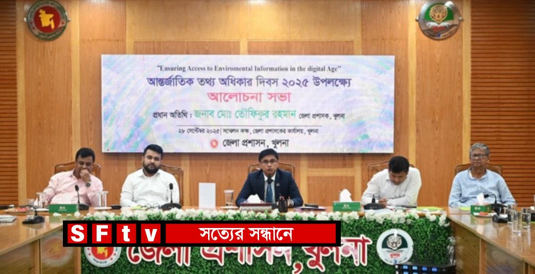 এম জালাল উদ্দীন : পরিবেশ রক্ষায় ডিজিটাল যুগে তথ্যের অধিকার নিশ্চিতকরণ" প্রতিপাদ্য'কে সামনে রেখে খুলনায় আন্তর্জাতিক তথ্য অধিকার দিবস উপলক্ষে আলোচনা সভা অনুষ্ঠিত হয়েছে। রবিবার(২৮ সেপ্টেম্বর) জেলা প্রশাসকের কার্যালয়ের সম্মেলনকক্ষে আয়োজিত আলোচনা সভায় প্রধান অতিথি ছিলেন, খুলনা জেলা প্রশাসক ও জেলা ম্যাজিস্ট্রেট মোঃ তৌফিকুর রহমান। অনুষ্ঠানে সভাপতিত্ব করেন অতিরিক্ত জেলা প্রশাসক (শিক্ষা ও আইসিটি) নূরুল হাই মোহাম্মদ আনাছ। বিশেষ অতিথি হিসেবে উপস্থিত ছিলেন অতিরিক্ত জেলা প্রশাসক (সার্বিক) বিতান কুমার মন্ডল, উমেশচন্দ্র পাবলিক লাইব্রেরির সাধারণ সম্পাদক অধ্যাপক আনোয়ারুল কাদির এবং খুলনা আঞ্চলিক তথ্য অফিসের উপপ্রধান তথ্য অফিসার এ এস এম কবীর। তথ্য অধিকার বিষয়ে মূল ধারণাপত্র উপস্থাপন করেন টিআইবির এরিয়া কো-অর্ডিনেটর মোঃ আব্দুল্লাহ-আল মামুন। অনুষ্ঠানে সরকারি-বেসরকারি বিভিন্ন দপ্তরের কর্মকর্তা-কর্মচারীরা অংশগ্রহণ করেন। জেলা প্রশাসনের আয়োজনে অনুষ্ঠিত এ আলোচনা সভায় বক্তারা তথ্য অধিকার নিশ্চিতকরণের মাধ্যমে স্বচ্ছতা, জবাবদিহিতা ও সুশাসন প্রতিষ্ঠার ওপর গুরুত্বারোপ করেন।