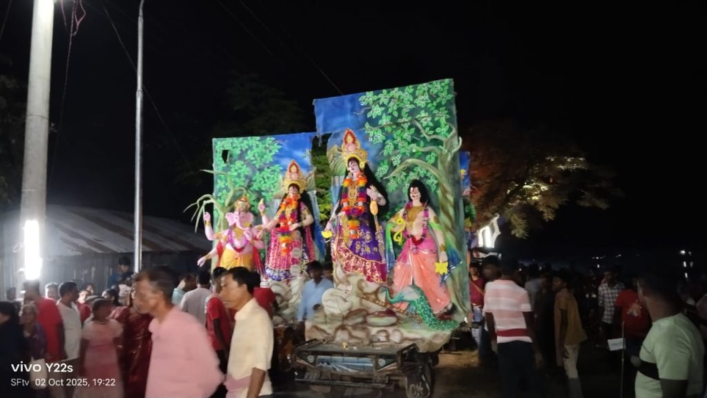 চুয়াডাঙ্গার আলমডাঙ্গা উপজেলায় শারদীয় দুর্গোৎসবের সমাপ্তি উপলক্ষে ৩৫টি পূজা মণ্ডপের প্রতিমা বৃহস্পতিবার সন্ধ্যা ছয়টা থেকে আনুষ্ঠানিকভাবে বিসর্জন দেওয়া হয়। ধর্মীয় আচার-অনুষ্ঠান অনুসরণ করে একে একে প্রতিমাগুলো শোভাযাত্রার মাধ্যমে বিভিন্ন স্থানে নিয়ে গিয়ে বিসর্জনের মধ্য দিয়ে পূজা-পর্বের কার্যক্রম শেষ হয়। বিসর্জন উৎসবকে ঘিরে আইন-শৃঙ্খলা রক্ষাকারী বাহিনী কঠোর নিরাপত্তা ব্যবস্থা গ্রহণ করে। পুলিশ, সেনাবাহিনী, র্যাব, আনসার ও গোয়েন্দা সংস্থার সদস্যরা মাঠে থেকে সর্বাত্মক নিরাপত্তা নিশ্চিত করেন। ফলে পুরো প্রক্রিয়াটি কোনো অপ্রীতিকর ঘটনা ছাড়াই শান্তিপূর্ণভাবে সম্পন্ন হয়। আলমডাঙ্গা উপজেলা নির্বাহী অফিসার শেখ মেহেদী ইসলাম বলেন, দুর্গাপূজা শুরু হওয়ার আগ মুহূর্ত থেকেই জেলা প্রশাসকের নেতৃত্বে প্রতিটি পূজা মণ্ডপের সভাপতি ও সম্পাদকদের নিয়ে আমরা মিটিং করেছি। প্রয়োজনীয় সব নির্দেশনা দিয়েছি। সবার সহযোগিতায় এবারের প্রতিমা বিসর্জন সুন্দরভাবে সম্পন্ন হয়েছে। এখন পর্যন্ত কোনো অভিযোগ পাইনি। শান্তিপূর্ণভাবে সনাতন ধর্মাবলম্বীরা তাদের ধর্মীয় উৎসব পালন করেছেন।” আলমডাঙ্গা থানা অফিসার ইনচার্জ ওসি মোঃ মাসুদুর রহমান পিপিএম জানান পুলিশ , প্রতিটি মণ্ডপে নিরাপত্তা জোরদার ছিল। আইনশৃঙ্খলা বাহিনীর সদস্যরা শোভাযাত্রার শুরু থেকে শেষ পর্যন্ত অবস্থান করে ভক্তদের স্বস্তি নিশ্চিত করেন। আলমডাঙ্গা উপজেলা পূজা উদযাপন কমিটির সভাপতি অমল কুমার বিশ্বাস বলেন, এইবার আলমডাঙ্গা উপজেলায় ৩৫টি পূজা মণ্ডপের প্রতিমা আনুষ্ঠানিকভাবে বিসর্জন দেওয়া হয়েছে। শান্তিপূর্ণ ও উৎসবমুখর পরিবেশে বিসর্জন সম্পন্ন হওয়ায় আমরা কৃতজ্ঞ। আইন-শৃঙ্খলা বাহিনী, প্রশাসন, রাজনৈতিক নেতৃবৃন্দ ও সাংবাদিক বন্ধুদের প্রতি বিশেষ ধন্যবাদ জানাই। সবাই আমাদের সার্বিক সহযোগিতা ও পরামর্শ দিয়ে পাশে ছিলেন।” বিসর্জন যাত্রায় অংশ নেওয়া ভক্ত শ্রী সমীর কুমার দে বলেন, আমরা প্রতি বছর বিসর্জনে অংশ নিই, তবে এবার নিরাপত্তা ও শৃঙ্খলা ছিল সবচেয়ে ভালো। নির্বিঘ্নে দেবীকে বিদায় জানাতে পেরে আমরা আনন্দিত। অন্য এক ভক্ত মিতা রানী সাহা বলেন, “মণ্ডপ থেকে শোভাযাত্রায় অংশ নিতে এসে মনে হয়েছে সত্যিই উৎসব হচ্ছে। আইনশৃঙ্খলা বাহিনী ও প্রশাসন যেভাবে নজরদারি করেছে, তাতে পরিবার-পরিজন নিয়ে আসতে কোনো ভয় ছিল না।” আরেকজন তরুণ ভক্ত অভিজিৎ চক্রবর্তী বলেন, “আমরা চাই আগামী বছরগুলোতেও এভাবে শান্তিপূর্ণভাবে পূজা ও বিসর্জন অনুষ্ঠিত হোক। সবাই মিলে সম্প্রীতির পরিবেশে উৎসব পালন করাটাই সবচেয়ে বড় আনন্দ।” স্থানীয় প্রশাসন ও আইনশৃঙ্খলা বাহিনীর তৎপরতায় আলমডাঙ্গা জুড়ে বিসর্জন উৎসব উৎসবমুখর ও শান্তিপ