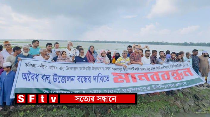মোঃ নুরুজ্জামান খোকন : পিরোজপুরের কাউখালী উপজেলাধীন ১নং সয়না রঘুনাথপুর ইউনিয়ন সংলগ্ন, কালীগঙ্গা নদী থেকে ড্রেজার দিয়ে অবৈধ ভাবে বালু উত্তোলনের প্রতিবাদে এলাকাবাসীর আয়োজনে মানববন্ধন কর্মসূচি পালন করা হয়। ৪ অক্টোবর (শনিবার) সকাল ১০ঘটিকায় উপজেলার ১নং সয়না রঘুনাথপুর ইউনিয়নের সয়না গ্রামের নদী তীরবর্তী ক্ষতিগ্রস্ত শতাধিক পরিবার এ মানববন্ধন করে। জানা যায় কাউখালীর সয়না মৌজায় কালীগঙ্গা নদীতে জেলা প্রশাসক আড়াই একর বালুমহল ইজড়া দিয়ে আসছে,কিন্তু নির্দিষ্ট ইজারাকৃত জায়গা ছাড়াও দীর্ঘদিন ধরে ড্রেজার দিয়ে বালু উত্তোলন করার ফলে সয়না, ধাবরী,মেঘপাল গ্রাম সংলগ্ন নদী ভাঙন ব্যাপক ভাবে বৃদ্ধি পাওয়ায় ক্ষতিগ্রস্ত হচ্ছে এলাকাবাসী। ক্ষুব্ধ হয়ে উক্ত বিক্ষোভ ও মানববন্ধন কর্মসূচি পালন করে। এ সময় ১নং সয়না রঘুনাথপুর ইউনিয়ন পরিষদের ভারপ্রাপ্ত চেয়ারম্যান রুস্তুম আলী সরদারের সভাপতিত্বে বক্তব্য রাখেন, উপজেলা বিএনপির সাধারণ সম্পাদক এইচ এম দ্বীন মোহাম্মদ,সমাজসেবী নজরুল ইসলাম তালুকদার,বিএনপি নেতা কবির হোসেন সিকদার,ছাত্রনেতা আল আমিন,ইউপি সদস্য ফিরোজ খান, ইউপি সদস্য সোনালি রানী দাস প্রমুখ। এ বিষয়ে ইউনিয়ন চেয়ারম্যান আবু সাঈদ তিনি শারীরিক অসুস্থতায় ঢাকা থাকায় মুঠোফোনে তিনি বলেন,অবৈধ বালু উত্তোলনের বিষয়টি জেলা প্রশাসক ও উপজেলা নির্বাহী কর্মকর্তাকে লিখিতভাবে একাধীকবার অবগত করা হয়েছে। প্রশাসন সরজমিনে গিয়ে মোবাইল কোর্টের মাধ্যমে উত্তোলনকারীদের জরিমানা ও বলগেট জব্দ করলেও তাদের বালি উত্তোলন চলমান রয়েছে। এমনকি ঠিকাদার বিভিন্ন সময়ে ক্ষমতার অপব্যবহার করা সহ ভয়ভিতি প্রদর্শন করে আসছে। তিনি আরো বলেন এই দ্বীপটির চারদিকে নদী থাকায় ভাঙ্গন ঠেকানো সম্ভব নয়,তাই অবৈধ বালি উত্তোলন বন্ধ করা এবং আইনগত ব্যবস্থা গ্রহণ জরুরী। মানববন্ধনে অন্যান্য অংশগ্রহণকারীরা বলেন,অবৈধ ভাবে ড্রেজার দিয়ে বালু উত্তোলনের ফলে আমাদের বিপুল পরিমাণ ফসলি জমি এরই মধ্যে নদীগর্ভে বিলীন হয়ে গেছে। এভাবে যদি বালু উত্তোলন চলতে থাকলে এলাকার সব বাড়ি-ঘর ও ফসলি জমি নদীতে বিলীন হয়ে যাবে।