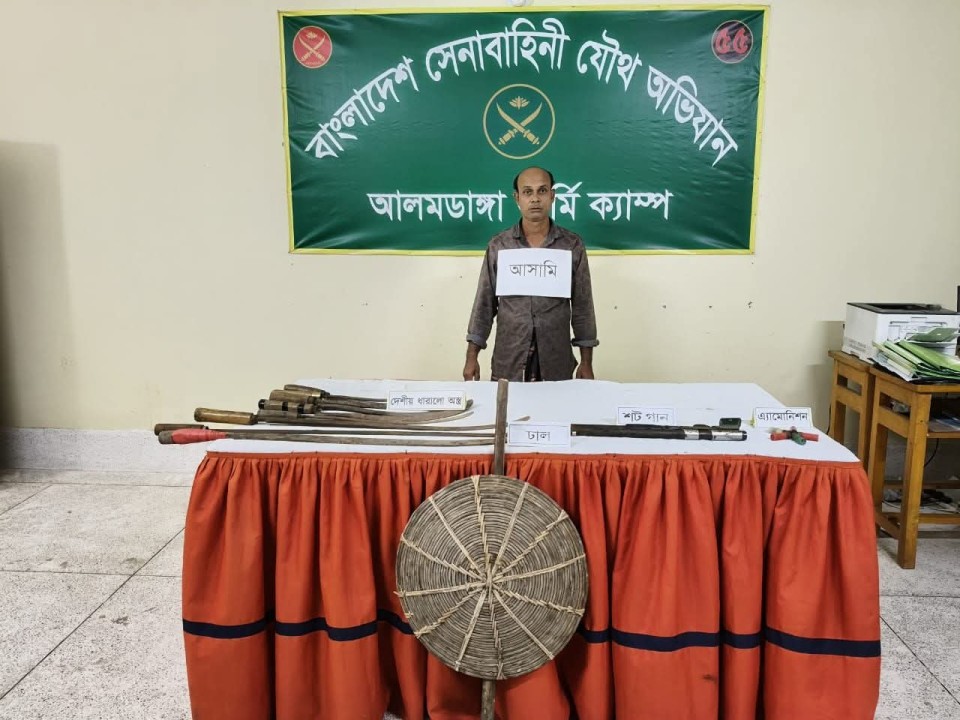 জানা যায়, আজ ভোর রাতে আলমডাঙ্গা উপজেলার কেশবপুর পূর্বপাড়ায় এই অভিযান চালানো হয়। যৌথ বাহিনী পূর্বপাড়ার বাসিন্দা সোয়াদ-এর বাড়ি থেকে ১টি শট গান, ৫ রাউন্ড গুলি, ৯টি ধারালো দেশীয় অস্ত্র এবং ১টি ঢাল উদ্ধার করে।