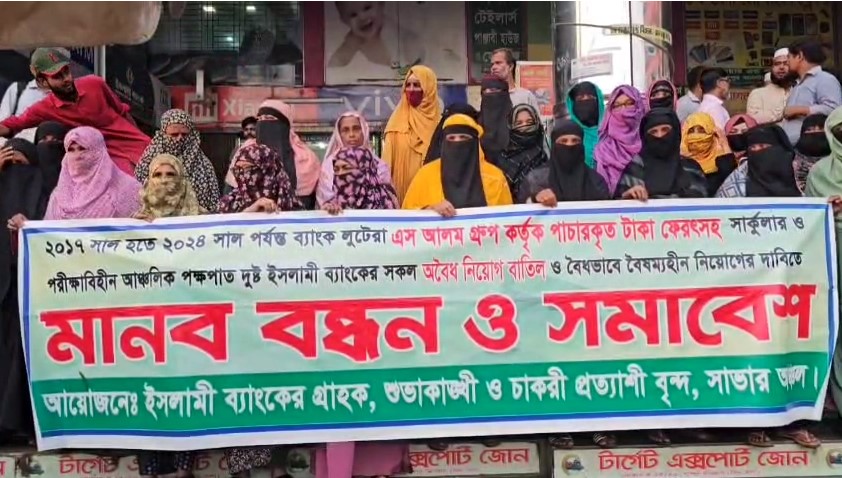 মোঃ আসিফুজ্জামান আসিফ: ইসলামী ব্যাংকে এস আলম গ্রুপের অবৈধ নিয়োগ বাতিল ও বিদেশে পাচারকৃত অর্থ ফেরত আনার দাবিতে সাভারে মানববন্ধন করেছে ইসলামী ব্যাংকের গ্রাহকরা। সোমবার (৬ অক্টোবর) বিকেলে ঢাকা-আরিচা মহাসড়কের হেমায়েতপুর বাসস্ট্যান্ড এলাকায় ইসলামী ব্যাংকের হেমায়েতপুর শাখার গ্রাহকরা এ মানববন্ধন কর্মসূচি পালন করেন। এতে নারী ও পুরুষসহ বিভিন্ন শ্রেণি-পেশার গ্রাহক অংশ নেন। মানববন্ধনে অংশগ্রহণকারীরা অভিযোগ করেন, ২০১৭ সাল থেকে ২০২৪ সাল পর্যন্ত এস আলম গ্রুপ ইসলামী ব্যাংকে অবৈধভাবে প্রায় সাত হাজার লোক নিয়োগ দিয়েছে। এসব নিয়োগপত্র বাতিল ও ব্যাংক থেকে পাচারকৃত অর্থ বিদেশ থেকে ফিরিয়ে আনার দাবি জানান তারা। এ সময় বক্তারা অন্তর্বর্তীকালীন সরকারের প্রধান উপদেষ্টার কাছে দ্রুত পদক্ষেপ নেওয়ার আহ্বান জানান।