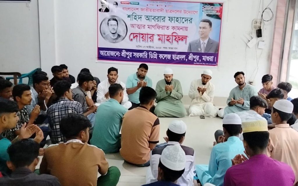 পলাতক ফ্যাসিস্ট আওয়ামী সরকারের প্রধানমন্ত্রী শেখ হাসিনার শাসনামলে ছাত্রলীগের নির্মম নির্যাতনে নিহত বুয়েটের তড়িৎ প্রকৌশল বিভাগের মেধাবী দেশপ্রেমিক শিক্ষার্থী শহীদ আবরার ফাহাদের ৬ষ্ঠ শাহাদতবার্ষিকী উপলক্ষে কেন্দ্রীয় কর্মসূচির অংশ হিসাবে মাগুরার শ্রীপুরে শহীদ আবরার ফাহাদের আত্মার মাগফেরাত কামনায় সরকারি ডিগ্রি কলেজ শাখা ছাত্রদলের আয়োজনে দোআ মাহফিল অনুষ্ঠিত হয়েছে।এ উপলক্ষে মঙ্গলবার (০৭ অক্টোবর) বিকালে শ্রীপুর কলেজ মোড়ে শ্রীপুর সরকারি কলেজ শাখা ছাত্রদলের সাবেক ও বর্তমান নেতাকর্মীদের আয়োজনে আলোচনা সভা ও দোআ মাহফিল অনুষ্ঠিত হয়।দোয়া মাহফিলে উপস্থিত ছিলেন, মাগুরা জেলা ছাত্রদলের সাবেক সহ সভাপতি মোঃ টুকু খাঁন, উপজেলা ছাত্রদলের সাবেক আহ্বায়ক এম বাবলু মিয়া, শ্রীপুর সরকারি ডিগ্রি কলেজ শাখা ছাত্রদলের সাবেক আহ্বায়ক মেহেদী হাসান অন্তর, সরকারি কলেজ শাখা ছাত্রদলের সাবেক সদস্য সচিব মামুনুর রশীদ, ছাত্রনেতা আব্দুল্লাহ আল ইমাম পুষ্প, সরকারি কলেজ শাখা ছাত্রদলের যুগ্ন আহ্বায়ক এম রাকিবুজ্জামান রোমান ও সোহান বিশ্বাস প্রমুখ।এছাড়াও শ্রীপুর সরকারি ডিগ্রি কলেজ শাখা ছাত্রদল নেতা মোঃ লিমন খাঁন, খন্দকার তালহা উদ্দিন ছান, ছাত্রনেতা আরিফুর রহমান, তিতাস হাসান মাহমুদ, মোঃ নাঈম শেখ, খন্দকার তৌহিদ ইসলাম তনু, মোল্লা সাজিদ, নাহিদ ইসলাম, তানজিল হোসেন, রিফাত বিশ্বাস, আকাশসহ ছাত্রদলের কলেজ শাখার সাবেক ও বর্তমান নেতাকর্মীরা উপস্থিত ছিলেন। আলোচনা সভায় সংক্ষিপ্ত বক্তব্যে বুয়েটের মেধাবী শিক্ষার্থী আবরার হোসেনের মৃত্যুকে শিক্ষা প্রতিষ্ঠানের ক্যাম্পাসে ছাত্রলীগের অপ রাজনীতি ও নিমর্মতার জলন্ত উদাহরণ হিসাবে দাবি করেন জেলা ছাত্রদলের সাবেক নেতা টুকু খাঁন।দোআ মাহফিলের অন্যতম আয়োজক মেহেদী হাসান অন্তর জানান, তিস্তার পানি নিয়ে ভারতীয় আগ্রাসনের বিরুদ্ধে প্রতিবাদ করায় স্বৈরাচার আওয়ামী লীগের মদদপুষ্ট নিষিদ্ধ ছাত্রলীগের হাতে নির্মমভাবে হত্যার শিকার হওয়া বুয়েটের মেধাবী শিক্ষার্থী আবরার হোসেনের আত্মার মাগফেরাত কামনায় আজকের এই দোআ মাহফিল। আলোচনা সভা শেষে বিশেষ দোআ মাহফিল পরিচালনা করেন মদনপুর জামে মসজিদের ইমাম হাফেজ মাওলানা আবু হুরাইরা জামিল।