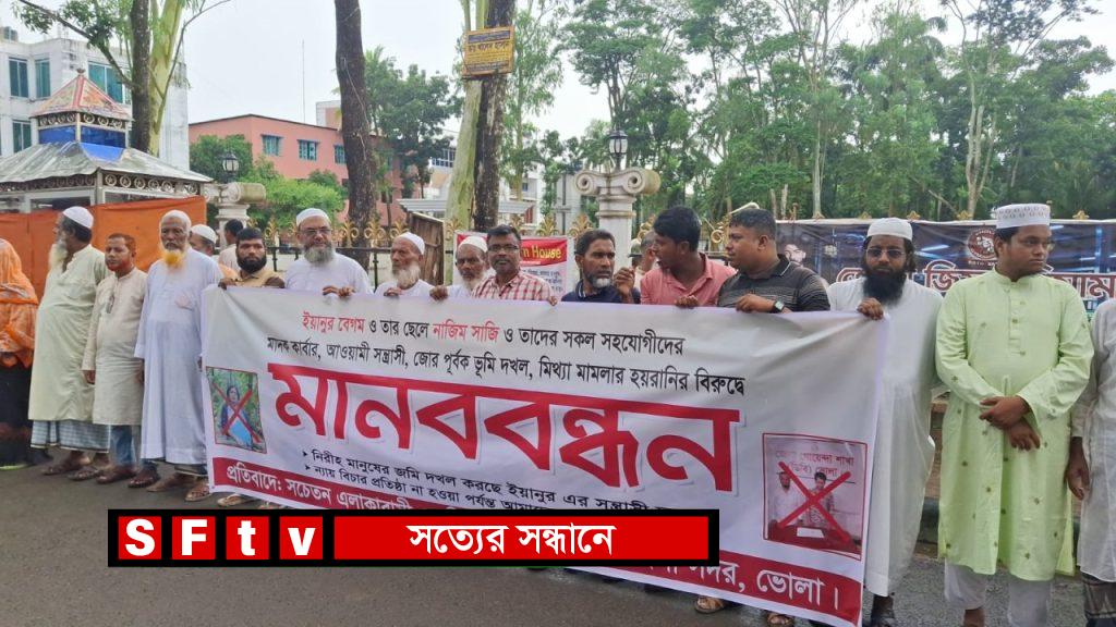 মোঃ আব্দুর রহমান হেলাল , ভোলা সদর উপজেলার আলীনগর ইউনিয়নে মাদক ব্যবসা ও ভূমিদখলকারী চক্র ইয়ানুর বেগম পরিবারকে গ্রেপ্তারের দাবিতে এলাকাবাসী বিক্ষোভ ও মানববন্ধন করেছে। শনিবার (১১ অক্টোবর) সকালে ভোলা প্রেসক্লাবের সামনে বৈরী আবহাওয়া উপেক্ষা করে সচেতন এলাকাবাসীর ব্যানারে ঘণ্টাব্যাপী এই মানববন্ধন অনুষ্ঠিত হয়। মানববন্ধনে কয়েক শতাধিক নারী-পুরুষ অংশ নেন। তারা বলেন, আলীনগর ইউনিয়নের ৭নং ওয়ার্ডে মাদক ব্যবসার ভয়াবহতা দিন দিন বেড়েই চলছে। ইয়ানুর বেগম ও তার ছেলে নাজিম সাঝি দীর্ঘদিন ধরে এলাকায় ইয়াবা, গাঁজা, মদসহ বিভিন্ন নেশাজাত দ্রব্যের কারবার চালিয়ে যাচ্ছে।