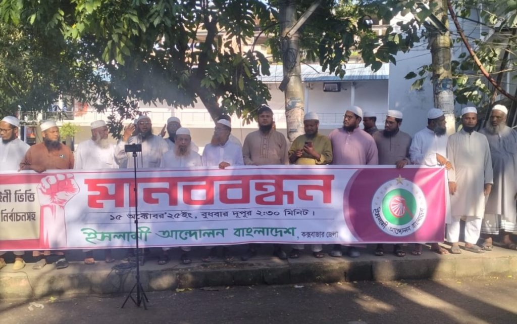ইসলামী আন্দোলন বাংলাদেশ কক্সবাজার জেলা শাখার উদ্যোগে জেলা সভাপতি মুহাদ্দিস মাওলানা আমিরুল ইসলাম মীর ও জয়েন্ট সেক্রেটারি মুস্তাফিজুল হক চৌধুরীর সঞ্চালনায় অনুষ্ঠিত মানববন্ধনে প্রধান অতিথি হিসেবে উপস্থিত ছিলেন কেন্দ্রীয় আন্তর্জাতিক বিষয়ক উপকমিটির সদস্য মাওলানা মোঃ আলী নজির। বক্তব্য রাখেন জেলা সহ-সভাপতি ক্বারী আবদুল খালেক নিজামী, সেক্রেটারী এআরএম ফরিদুল আলম, প্রশিক্ষণ সম্পাদক মাওলানা ক্বারী আবু নাছের, জেলা স্বাস্থ্য ও পরিবেশ বিষয়ক সম্পাদক ডা ইসমাইল, জেলা সদস্য ও ঈদগাহ উপজেলা সভাপতি মাওলানা শামসুল হক আজিজী, সহ-সাংগঠনিক সম্পাদক আবদুল হামিদ, সহ দপ্তর মাওলানা আমানুল হক আমান, ইসলামী যুব আন্দোলন জেলা সেক্রেটারি মাওলানা আনোয়ার সাকী, পৌর সেক্রেটারি আব্দুল খালেক প্রমুখ।
