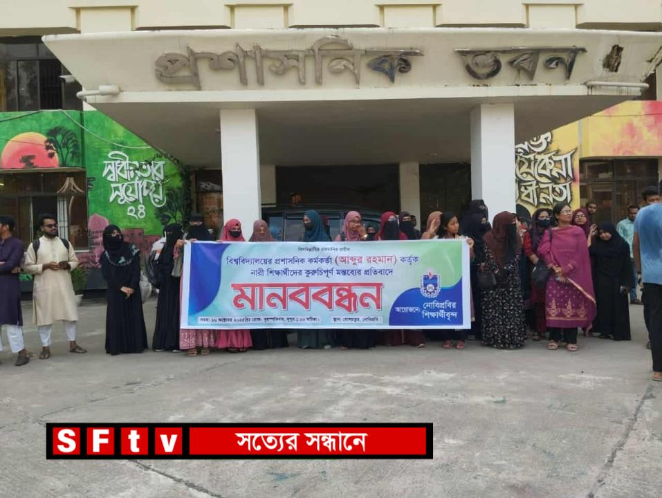তারা জানান, মোহাম্মদ রহমান কেবল নোবিপ্রবির ছাত্রীদের ব্যক্তিগত মর্যাদা ও নিরাপত্তাবোধকে হেয় করেনি, বরং নারী শিক্ষার্থীদের প্রতি সামষ্টিকভাবে ঘৃণাপূর্ণ ও অশালীন দৃষ্টিভঙ্গি প্রকাশ করেছে। একজন প্রশাসনিক কর্মকর্তার দায়িত্বশীল অবস্থান থেকে এ ধরনের নিন্দনীয় বক্তব্য কেবল অনভিপ্রেতই নয়, বরং বিশ্ববিদ্যালয়ের নীতিমালা, পেশাগত আচরণবিধি ও নারী-পুরুষ সমতার সাংবিধানিক মূল্যবোধেরও পরিপন্থী।