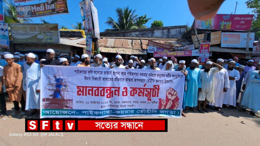খুলনার পাইকগাছায় কৃষি কলেজের প্রধান ফটকে স্থাপিত ভাস্কর্য অপসারণের দাবিতে তৌহিদী জনতার উদ্যোগে মানববন্ধন ও প্রতিবাদ সমাবেশ অনুষ্ঠিত হয়েছে। মঙ্গলবার (২১ অক্টোবর) সকাল ১০টায় পাইকগাছার জিরোপয়েন্ট এলাকায় এ কর্মসূচি অনুষ্ঠিত হয়। সমাবেশে বক্তারা বলেন, কৃষি কলেজের গেটে সম্মুখে ভাস্কর্য স্থাপনের মাধ্যমে পাইকগাছা-কয়রার ধর্মপ্রাণ মানুষের ঈমান ও ধর্মীয় অনুভূতিতে আঘাত হানা হয়েছে। তারা অবিলম্বে ওই ভাস্কর্য অপসারণের জোর দাবি জানান এবং ভবিষ্যতে এমন ধর্মবিরোধী কর্মকাণ্ড থেকে সংশ্লিষ্টদের বিরত থাকার আহ্বান জানান। বক্তারা আরও বলেন, যদি ৭২ ঘণ্টার মধ্যে ভাস্কর্য অপসারণ না করা হয়, তবে তৌহিদী জনতা বৃহত্তর আন্দোলনের ডাক দিতে বাধ্য হবে। পাশাপাশি, ভাস্কর্যের স্থানে আল্লাহর নাম সংবলিত ফলক স্থাপনেরও দাবি জানান তারা। মানববন্ধনে সভাপতিত্ব করেন কমলাপুর মাদ্রাসার নায়েবে মুহতামিম আলহাজ্ব মাওলানা আঃ আজিজ। বক্তব্য রাখেন মাওলানা হাফেজ আঃ রব, মুফতী উয়াইস, মাওলানা মনিরুল ইসলাম, মাওলানা হাফেজ শামছুদ্দীন, মাওলানা রইসুল ইসলাম, মাওলানা সাইদুর রহমান, মাওলানা শরীফুল ইসলাম, মাওলানা আসাদুল্লাহ আল গালিব, মাওলানা আতাউল গনি, মাওলানা ইলিয়াস আমিন ও মাওলানা ফরহাদ হুসাইনসহ অনেকে। বক্তারা একযোগে ঘোষণা দেন- ধর্মীয় মূল্যবোধ ও ইসলামী চেতনার পরিপন্থী যেকোনো কর্মকাণ্ডের বিরুদ্ধে তৌহিদী জনতা ঐক্যবদ্ধভাবে প্রতিরোধ গড়ে তুলবে।