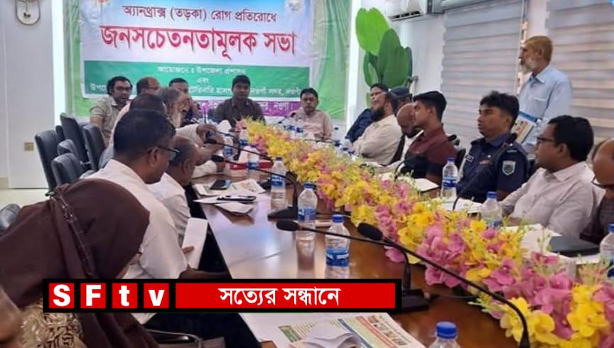 উজ্জ্বল কুমার সরকার ; নওগাঁয় অ্যানথ্রাক্স(তড়কা) রোগ প্রতিরোধে এক জনসচেনতামূলক সভা অনুষ্ঠিত হয়েছে। বৃহস্পতিবার সদর উপজেলা পরিষদ সভা কক্ষে সদর উপজেলা প্রশাসন ও উপজেলা প্রাণিসম্পদ দপ্তরের আয়োজনে এই সভা অনুষ্ঠিত হয়। সভায় প্রধান অতিথি হিসেবে উপস্থিত থেকে দিক নিদের্শনামূলক বক্তব্য রাখেন সদর উপজেলা নির্বাহী কর্মকর্তা মো: ইবনুল আবেদীন। এছাড়াও সভায় সদর উপজেলা প্রাণিসম্পদ কর্মকর্তা ডা: মো: আমিনুল ইসলাম, সদর উপজেলা প্রকল্প বাস্তবায়ন কর্মকর্তা প্রকৌশলী মো: মাহবুবুর রহমান, উপজেলা প্রশাসনের অন্যান্য দপ্তরের প্রধান কর্মকর্তাবৃন্দ, সদর থানার কর্মকর্তা, সদর উপজেলা বিএনপির সভাপতি দেওয়ান মোস্তাক আহমেদ রাজা, স্থানীয় জনপ্রতিনিধি, মাংস ব্যবসায়ী, ইউপি চেয়ারম্যানবৃন্দসহ প্রমুখ উপস্থিত ছিলেন। সভায় উপজেলা প্রাণীসম্পদ দপ্তরের পক্ষ থেকে তড়কা রোগ প্রতিরোধের উপর একটি সচেতনমূলক প্রামাণ্যচিত্র উপস্থাপন করা হয়। এছাড়া সভায় আগত সকলকে তড়কা রোগ প্রতিরোধে সচেতনমূলক লিফলেট প্রদান করা হয়। এসময় উপজেলা নির্বাহী কর্মকর্তা বলেন তড়কা রোগ খুবই মারাত্মক একটি পশুবাহিত রোগ। তাই অসুস্থ গরু জবাই করা থেকে সবাইকে বিরত থাকতে হবে। এছাড়া জবাইকৃত পশু যে রোগমুক্ত তার প্রত্যয়ন অবশ্যই সঙ্গে রাখতে হবে। উপজেলার মাংস ব্যবসায়ীদের এই বিষয়গুলো মেনে গরু জবাই করার প্রতি অনুরোধ জানানো হয়। এই নিয়মগুলো যারা মানবে না তাদের বিরুদ্ধে কঠোর আইনগত ব্যবস্থা গ্রহণের কথা জানান এই কর্মকর্তা।