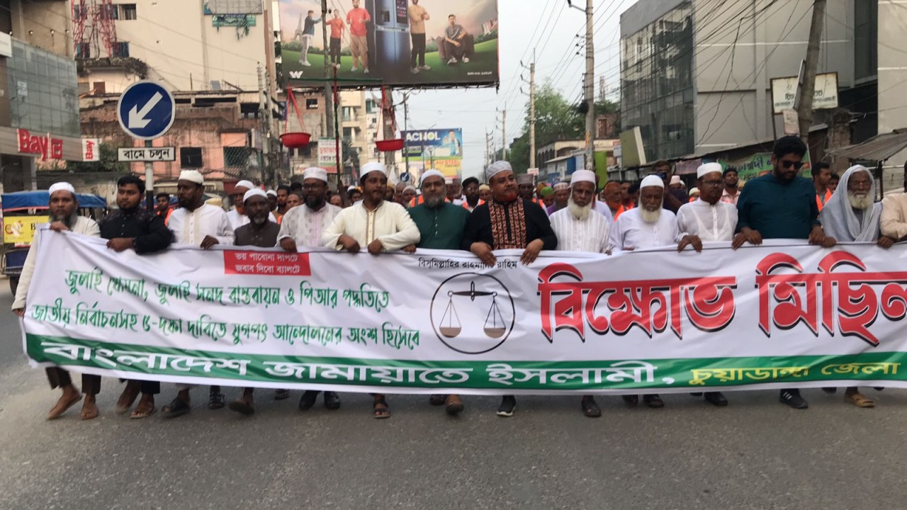 বিক্ষোভ সমাবেশে বক্তব্য রাখেন এবং সভাপতিত্ব করেন বাংলাদেশ জামায়াতে ইসলামী চুয়াডাঙ্গা জেলা শাখার আমীর অ্যাডভোকেট রুহুল আমিন এসময় তিনি বলেন স্বৈরাচার ফ্যাসিস্ট আওয়ামী লীগের আমলে জামায়াত নেতাকর্মীরা সীমাহীন অত্যাচার ও নির্যাতনের শিকার হয়েছেন। ফ্যাসিস্ট শেখ হাসিনা সচিবালয়, মিডিয়া সহ সবকিছু নিজের দখলে রেখেছিলেন। তার বাইরে গেলে ক্রসফায়ার ও 'আয়নাঘর' তৈরি করা হতো। শেখ হাসিনা ২০৪১ সাল পর্যন্ত ক্ষমতায় থাকতে চেয়েছিলেন, কিন্তু জুলাই আন্দোলনের মাধ্যমে সরকারের পতন হয়েছে এবং তার সকল পরিকল্পনা ভেঙে গেছে। জুলাই আন্দোলনে শেখ হাসিনা রান্না করা ভাতও খেতে পারেননি, তাকে দেশ থেকে পালাতে হয়েছে। তারা সকল রাজনৈতিক সংগঠনের প্রতি আহ্বান জানান, শেখ হাসিনার এই পরিণতি থেকে শিক্ষা নিয়ে যেন জনবিচ্ছিন্ন বা ফ্যাসিস্ট না হন। আল্লাহর পরিকল্পনার কাছে মানুষের সকল পরিকল্পনা ব্যর্থ হয়েছে, তাই যারা শেখ হাসিনার মতো ফ্যাসিস্ট হতে চান, তাদেরও একই পরিণতি হবে। জামায়াতে ইসলামী সবসময় মানুষের মুক্তির জন্য কাজ করেছে। তারা দুর্নীতি ও অনিয়মমুক্ত করে একটি সুন্দর সমাজ গঠন এবং দেশের রাজনৈতিক সংস্কৃতির পরিবর্তন আনতে চান।