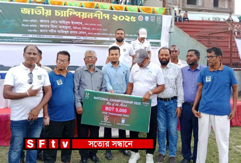 জাতীয় ফুটবল চ্যাম্পিয়নশীপ – ২০২৫ খুলনা বিভাগীয় অঞ্চলের ফাইনাল খেলা মাগুরা স্টেডিয়ামে অনুষ্ঠিত হয়েছে। বাংলাদেশ ফটুবল ফেডারেশনের আয়োজনে ও মাগুরা জেলা ফুটবল এসোসিয়েশন এবং মাগুরা জেলা ক্রীড়া সংস্থার সার্বিক তত্বাবধানে সোমবার ২৭ অক্টোবর দুপুর ২ টায় জেলা স্টেডিয়ামে এই খেলা অনুষ্ঠিত হয়। খুলনা বিভাগের ১০ টি জেলা লীগ পর্যায়ে খেলার পর খুলনা ও যশোর জেলা ফাইনালে খেলার যোগ্যতা অর্জনকরে। খেলার ৫১ মিনিটে যশোরের ফাহিম গোল করে যশোরকে এগিয়ে নেয়। ৯০ মিনিটের খেলায় বাকী সময়ে আর কোন গোল না হলে যশোর জেলা বিজয় লাভ করে।এই বিজয়ের ফলে যশোর জেলা দল আগামীতে খুলনা বিভাগ থেকে ঢাকায় খেলার যোগ্যতা অর্জন করলো। আজকের খেলায় যশোর দলের ফাহিম ম্যান অফদি ম্যাচ নির্বাচিত হয়।