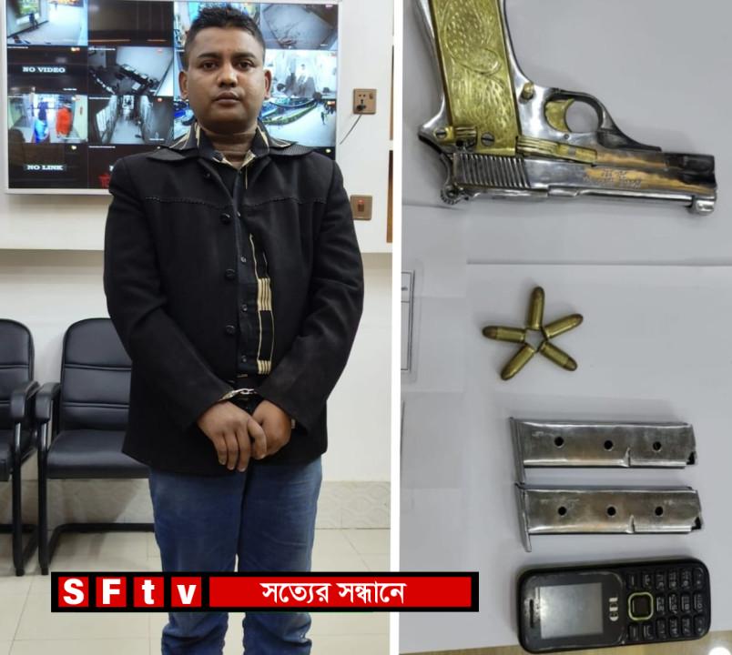চাঁপাইনবাবগঞ্জে আমেরিকার তৈরি পিস্তল ও গুলিসহ রয়েল হাসান অরণ্য (৩৫) নামে এক যুবককে আটক করেছে পুলিশ। গতকাল ১ ডিসেম্বর সোমবার বিকাল সাড়ে চার ঘটিকায় চাঁপাইনবাবগঞ্জ পৌরসভার রেহাইচর এলাকার মহানন্দা সেতুর টোলপ্লাজায় তাকে আটক করা হয়। চাঁপাইনবাবগঞ্জের অতিরিক্ত পুলিশ সুপার এনএম ওয়াসিম ফিরোজ এ তথ্য নিশ্চিত করেছেন। রয়েল হাসান অরণ্য শিবগঞ্জের মনাকষা ইউনিয়নের পারচোকা মাদ্রাসা বাজারের মৃত আল মামুনের ছেলে। অতিরিক্ত পুলিশ সুপার এনএম ওয়াসিম ফিরোজ বলেন, গোপন তথ্যের ভিত্তিতে টোলপ্লাজায় চেকপোস্ট বসিয়ে যানবাহনে তল্লাশী চালায় পুলিশের একটি দল। এ সময় সিএনজি চালিত একটি অটোরিকশা থেকে একটি পিস্তল, ৫ রাউন্ড গুলি ও দুটি ম্যাগজিনসহ রয়েল হাসান অরণ্যকে আটক করা হয়। অরণ্য শিবগঞ্জ থেকে চাঁপাইনবাবগঞ্জ শহর আসছিলেন। ওয়াসিম ফিরোজ বলেন, জব্দ করা ৭ দশমিক ৬৫ (মিলিমিটার) পিস্তলটি আমেরিকার তৈরী। এ ব্যাপারে মামলা দায়েরের প্রস্তুতি চলছে বলেও জানান তিনি।