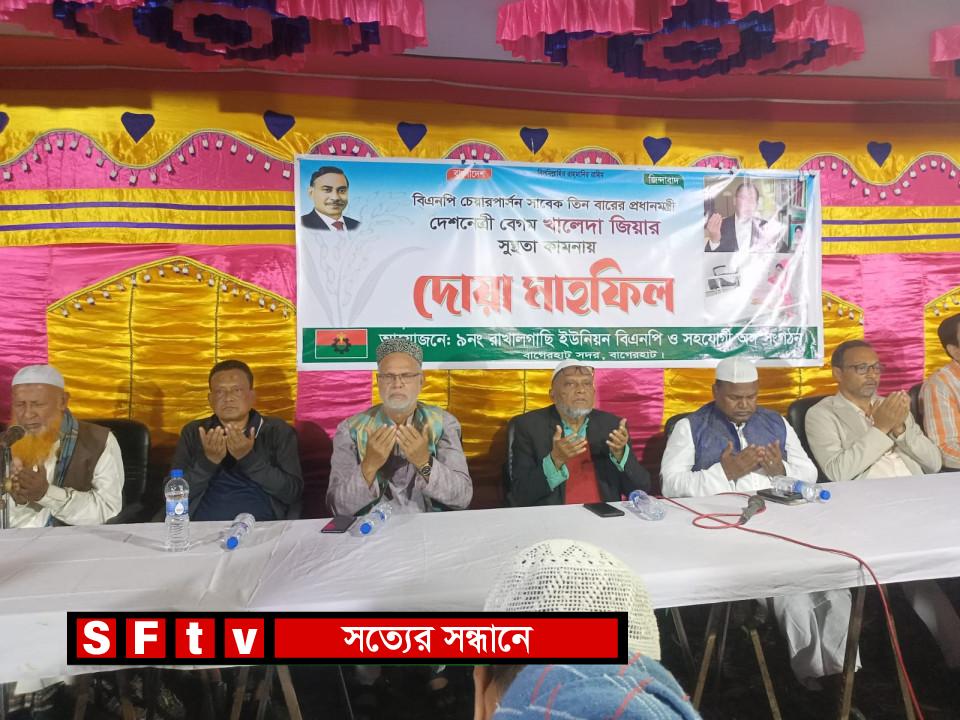 বাগেরহাট সদর উপজেলার ৯নং বাখালগাছি বিএনপি’র অঙ্গ ও সহযোগি সংগঠনের আয়োজনে দেশের ৩ বারের সাবেক প্রানমন্ত্রী ও দলের চেয়ারপারসন বেগম খালেদা জিয়ার সুস্থতা কামনায় এক দোয়া মাহফিল অনুষ্ঠিত হয়েছে। বুধবার (৫ ডিসেম্বর) সন্ধ্যায় রাখালগাছি ইউনিয়নের কাবির হাওলাদারের বটতলা চত্বরে এ দোয়া মাহফিলের আয়োজন করা হয়। দোয়া মাহফিল দেশের ৩ বারের সাবেক প্রধানমন্ত্রীর দ্রুত আরোগ্য লাভ এবং পুনরায় জনগনের সেবায় নিয়োজিত হওয়ার জন্য মহান আল্লাহর দরবারে ফরিয়াদ করেন। রাখালগাছি ইউনিয়ন বিএনপি’র সভাপতি ফকির আল মামুন টিপুর সভাপতিত্বে ও বিএনপি নেতা সালাম বিশ্বাসের সঞ্চালনায় দোয়া মাহফিলে প্রধান অতিথি হিসেবে উপস্থিত ছিলেন ইঞ্জিনিয়ার এটিএম আকরাম হোসেন তালিম। প্রধান বক্তা হিসেবে উপস্থিত ছিলেন বাগেরহাট জেলা বিএনপি’র সাবেক সভাপতি ও বর্তমান প্রধান সমন্বয়ক এম এ সালাম। বিশেষ অতিথি ছিলেন জেলা বিএরপি’র সদস্য ইঞ্জিনিয়ার মাসুদ রানা, বাগেরহাট সদর থানা বিএরপি’র সভাপতি সৈয়দ নাসির আহমেদ মালেক, সাধারণ সম্পাদক আবুল কালাম আজাদ বুলু, পৌর বিএনপি নেতা শমসের আলী মোহন, জেলা সেচ্ছাসেবকদলের আহবায়ক জাহিদুল ইসলাম শান্ত, জেলা শ্রমিকদলের সাবেক সভাপতি লিয়াকত সরদার, রাখালগাছি ইউনিয়ন বিএনপি নেতা শেখ হাসান আল মামুন বাপ্পি, খানপুর ইউনিয়ন বিএনপি’র সভাপতি খান হাফিজুর রহমান, সাধারণ সম্পাদক মো: বাবুল ফকির, বিএনপি নেতা শেখ সেলিম, ওহিদুজ্জামান দিপু প্রমুখ। অনুষ্ঠানের প্রধান বক্তা এম এ সালাম বলেন, দেশের এই ক্রান্তিলগ্নে সর্বজন স্বীকৃত সাবেক এই প্রধানমন্ত্রীকে অসুস্থ হয়ে রাজধানীর এভারকেয়ার হাসপাতালে চিকিৎসাধীন রয়েছে আমাদের কাছ থেকে তাকে ছিনিয়ে নেবেন না। এ ছাড়া শহীদ প্রেসিডেন্ট জিয়াউর রহমানের রুহের মাগফিরাত কামনা করেন এবং খালেদা জিয়ার কনিষ্ঠ পুত্র মরহুম আরাফাত রহমান কোকোর রুহের মাগফিরাত কামনা করে বিশেষ দোয়া করেন। পাশাপাশি, বাংলাদেশ জাতীয়তাবাদী দলের ভারপ্রাপ্ত চেয়ারম্যান তারেক রহমানের সুস্থতা এবং সার্বিক কল্যাণের জন্য দোয়া করেন।