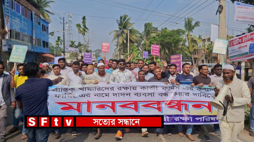 ভোলায় কাজী ফার্মসের কন্ট্রাক্ট ফার্মিংয়ের নামে চলমান দাদন ব্যবসা বন্ধ এবং প্রান্তিক খামারিদের ন্যায্য অধিকার প্রতিষ্ঠার দাবিতে মানববন্ধন, বিক্ষোভ মিছিল ও স্মারকলিপি প্রদান কর্মসূচি অনুষ্ঠিত হয়েছে। বুধবার (৩ ডিসেম্বর) বোরহানউদ্দিন উপজেলার কুঞ্জেরহাট বাজার সংলগ্ন কাজী ফার্মস ভোলা ব্রাঞ্চ অফিসের সামনে ‘প্রান্তিক খামারি রক্ষা পরিষদ’-এর ব্যানারে ঘন্টাব্যাপী মানববন্ধন অনুষ্ঠিত হয়। “আমাদের পিঠ দেয়ালে ঠেকে গেছে”—বক্তাদের হুঁশিয়ারি মানববন্ধনে বক্তারা অভিযোগ করেন, কাজী ফার্মসের সিন্ডিকেট-কেন্দ্রিক দাদন ব্যবসার কারণে ভোলার প্রায় দশ হাজার প্রান্তিক পোল্ট্রি খামারি চরম সংকটে পড়েছে। উৎপাদন খরচ বেড়ে গেলেও বাজারে তারা ন্যায্য দাম পাচ্ছে না। অন্যদিকে কন্ট্রাক্ট ফার্মগুলোর বাচ্চা ও ফিড কম দামে সরবরাহ করায় প্রান্তিক খামারিরা প্রতিযোগিতায় টিকতে পারছেন না। তারা বলেন, “ভোলা দ্বীপ জেলা—এখান থেকে বাইরে যাওয়ার সড়ক নেই। ফলে আমরা উৎপাদিত মুরগি এখানেই বিক্রি করতে বাধ্য। কিন্তু কাজী ফার্মস নিয়মিত অসম দামে মুরগি বাজারজাত করায় স্থানীয় উৎপাদন খরচ তুলেই বলা যায় না। একের পর এক ফার্ম বন্ধ হয়ে যাচ্ছে, হাজারো মানুষ বেকার হয়ে পড়ছে।” ৭ দিনের আল্টিমেটাম বক্তারা ঘোষণা দেন—ভোলায় কন্ট্রাক্ট ফার্মিং বন্ধ করা না হলে আগামী সাত কর্মদিবস পর বৃহত্তর আন্দোলন শুরু করা হবে। তাদের দাবি— প্রান্তিক খামারিদের ন্যায্য দাম নিশ্চিত করতে হবে দাদন ব্যবসা বন্ধ করতে হবে খামারিদের কাছ থেকে ক্রয়কৃত বাচ্চা ও ফিডের দাম যৌক্তিক করতে হবে ভোলার বাজারে উৎপাদিত মুরগি বিক্রয় নিয়ন্ত্রণে সমতা আনতে হবে মানববন্ধনে উপস্থিত ছিলেন আহ্বায়ক মো. ইসমাইল গোলদার, যুগ্ম আহ্বায়ক মো. কামরুল আহসান, আব্দুর কাদের বিপ্লব, মো. হারুন, মো. সিরাজ, মো. সুমন, মো. কালু খলিফা, মো. হেলাল খানসহ শতাধিক প্রান্তিক খামারি। স্মারকলিপি প্রদান কর্মসূচি শেষে কাজী ফার্মস ভোলা ব্রাঞ্চের ইনচার্জ সালাউদ্দিন পলাশের মাধ্যমে ব্যবস্থাপনা পরিচালকের বরাবর স্মারকলিপি প্রদান করেন আন্দোলনকারীরা। প্রান্তিক খামারিরা আশা প্রকাশ করেন, “কাজী ফার্মস মানবিক বিবেচনায় সিদ্ধান্ত নেবে—নইলে আমরা কঠোর কর্মসূচিতে যেতে বাধ্য হবো।”