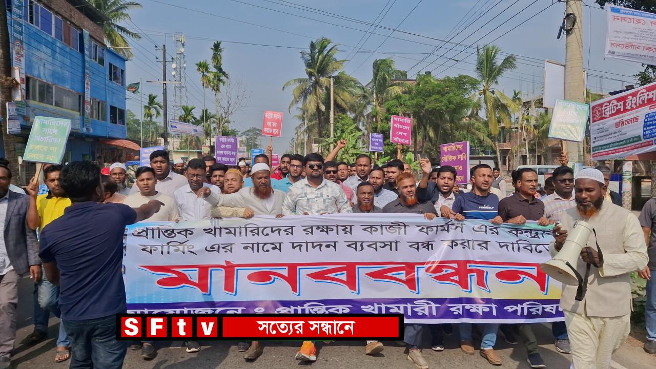 ভোলায় কাজী ফার্মসের কন্ট্রাক্ট ফার্মিংয়ের নামে চলমান দাদন ব্যবসা বন্ধ এবং প্রান্তিক খামারিদের ন্যায্য অধিকার প্রতিষ্ঠার দাবিতে মানববন্ধন, বিক্ষোভ মিছিল ও স্মারকলিপি প্রদান কর্মসূচি অনুষ্ঠিত হয়েছে। বুধবার (৩ ডিসেম্বর) বোরহানউদ্দিন উপজেলার কুঞ্জেরহাট বাজার সংলগ্ন কাজী ফার্মস ভোলা ব্রাঞ্চ অফিসের সামনে ‘প্রান্তিক খামারি রক্ষা পরিষদ’-এর ব্যানারে ঘন্টাব্যাপী মানববন্ধন অনুষ্ঠিত হয়। “আমাদের পিঠ দেয়ালে ঠেকে গেছে”—বক্তাদের হুঁশিয়ারি মানববন্ধনে বক্তারা অভিযোগ করেন, কাজী ফার্মসের সিন্ডিকেট-কেন্দ্রিক দাদন ব্যবসার কারণে ভোলার প্রায় দশ হাজার প্রান্তিক পোল্ট্রি খামারি চরম সংকটে পড়েছে। উৎপাদন খরচ বেড়ে গেলেও বাজারে তারা ন্যায্য দাম পাচ্ছে না। অন্যদিকে কন্ট্রাক্ট ফার্মগুলোর বাচ্চা ও ফিড কম দামে সরবরাহ করায় প্রান্তিক খামারিরা প্রতিযোগিতায় টিকতে পারছেন না। তারা বলেন, “ভোলা দ্বীপ জেলা—এখান থেকে বাইরে যাওয়ার সড়ক নেই। ফলে আমরা উৎপাদিত মুরগি এখানেই বিক্রি করতে বাধ্য। কিন্তু কাজী ফার্মস নিয়মিত অসম দামে মুরগি বাজারজাত করায় স্থানীয় উৎপাদন খরচ তুলেই বলা যায় না। একের পর এক ফার্ম বন্ধ হয়ে যাচ্ছে, হাজারো মানুষ বেকার হয়ে পড়ছে।” ৭ দিনের আল্টিমেটাম বক্তারা ঘোষণা দেন—ভোলায় কন্ট্রাক্ট ফার্মিং বন্ধ করা না হলে আগামী সাত কর্মদিবস পর বৃহত্তর আন্দোলন শুরু করা হবে। তাদের দাবি— প্রান্তিক খামারিদের ন্যায্য দাম নিশ্চিত করতে হবে দাদন ব্যবসা বন্ধ করতে হবে খামারিদের কাছ থেকে ক্রয়কৃত বাচ্চা ও ফিডের দাম যৌক্তিক করতে হবে ভোলার বাজারে উৎপাদিত মুরগি বিক্রয় নিয়ন্ত্রণে সমতা আনতে হবে মানববন্ধনে উপস্থিত ছিলেন আহ্বায়ক মো. ইসমাইল গোলদার, যুগ্ম আহ্বায়ক মো. কামরুল আহসান, আব্দুর কাদের বিপ্লব, মো. হারুন, মো. সিরাজ, মো. সুমন, মো. কালু খলিফা, মো. হেলাল খানসহ শতাধিক প্রান্তিক খামারি। স্মারকলিপি প্রদান কর্মসূচি শেষে কাজী ফার্মস ভোলা ব্রাঞ্চের ইনচার্জ সালাউদ্দিন পলাশের মাধ্যমে ব্যবস্থাপনা পরিচালকের বরাবর স্মারকলিপি প্রদান করেন আন্দোলনকারীরা। প্রান্তিক খামারিরা আশা প্রকাশ করেন, “কাজী ফার্মস মানবিক বিবেচনায় সিদ্ধান্ত নেবে—নইলে আমরা কঠোর কর্মসূচিতে যেতে বাধ্য হবো।”