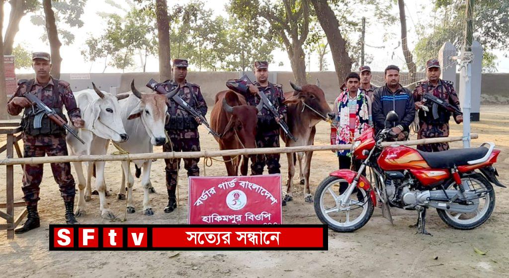 চাঁপাইনবাবগঞ্জ ব্যাটালিয়ন ৫৩ বিজিবি বিশেষ তথ্যের ভিত্তিতে আজ ০৬ ডিসেম্বর হাকিমপুর বিওপির একটি বিশেষ টহলদল চাঁপাইনবাবগঞ্জ জেলার সদর থানাধীন শাহাজাহানপুর ইউনিয়নের হাকিমপুর গ্রামে অভিযান পরিচালনা করে। বিজিবি আনুমানিক রাত ৪ টায় অভিযান চালিয়ে শিবগঞ্জ উপজেলার রঘুনাথপুর গ্রামের মোঃ তৈমুর রহমানের ছেলে মোঃ রজদুল (৩০) ও চাঁপাইনবাবগঞ্জ সদর উপজেলা চরবাগডাঙ্গা ইউনিয়নের বড়গোটাপাড়া গ্রামের মৃত আলাউদ্দীনের ছেলে মোঃ শাকিল (৩২) সহ ০৪টি ভারতীয় গরু, ০১টি মোটরসাইকেল ও ০২টি মোবাইলসহ আটক করতে সক্ষম হন। এছাড়াও ঘটনাস্থল থেকে একটি ব্যবহৃত মোটরসাইকেল উদ্ধার করা হয়। আটককৃত আসামীদের বিরুদ্ধে যথাযথ আইনানুগ ব্যবস্থা গ্রহণের নিমিত্তে জব্দকৃত গরু, মোটরসাইকেল ও মোবাইল চাঁপাইনবাবগঞ্জ সদর থানায় হস্তান্তর করার কার্যক্রম প্রক্রিয়াধীন। যার আনুমানিক সিজার মূল্য ০৭ (সাত) লক্ষ টাকা। চাঁপাইনবাবগঞ্জ ব্যাটালিয়ন (৫৩ বিজিবি) এর অধিনায়ক লেফটেন্যান্ট কর্নেল কাজী মুস্তাফিজুর রহমান, পিএসসি এ বিষয়ের সত্যতা নিশ্চিত করে বলেন, ব্যাটালিয়নের দায়িত্বপূর্ণ এলাকায় সীমান্ত নিরাপত্তা নিশ্চিত করা সহ যেকোনো ধরনের অবৈধ অনুপ্রবেশ ও চোরাচালান কার্যক্রম রোধে বিজিবি সবসময় তৎপর রয়েছে।
