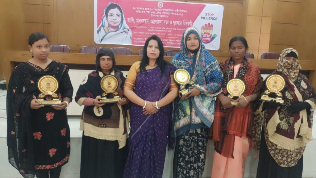 নওগাঁর মান্দা উপজেলা পরিষদের হল রুমে উপজেলা প্রশাসন ও মহিলা বিষয়ক অধিদপ্তর মান্দা ও ডাসকো ফাউন্ডেশনের ও গন উন্নয়ন কেন্দ্র মান্দা, নওগাঁর সহযোগীতায় আন্তর্জাতিক নারী নির্যাতন প্রতিরোধ পক্ষে এবং বেগম রোকেয়া দিবস-২০২৫ উদযাপন উপলক্ষে মানববন্ধন। আজ মঙ্গলবার বেলা ১১ টায় মান্দা উপজেলা পরিষদের হল রুমে উপজেলা প্রশাসন ও মহিলা বিষয়ক অধিদপ্তর মান্দা, নওগাঁর আয়োজনে এবং ডাসকো ফাউন্ডেশন ও গণ উন্নয়ন কেন্দ্র মান্দা, নওগাঁর সহযোগিতায় আন্তর্জাতিক নারী নির্যাতন প্রতিরোধ পক্ষ এবং বেগম রোকেয়া দিবস-২০২৫ উদযাপন উপলক্ষে র্যালি,মানববন্ধন, আলোচনা সভা ও পুরস্কার বিতরণী অনুষ্ঠানে এ ৫ জন অদম্য নারীকে পুরস্কারে ভূষিত করা হয়েছে। অদম্য নারীরা হলেন অর্থনৈতিকভাবে সাফল্য অর্জনকাররী প্রমীলা রানী পাহান,শিক্ষা ও চাকুরী ক্ষেত্রে সাফল্য অর্জনকারী নারী প্রীতি রানী,সফল জননী নারী মাহমুদা খানম,নির্যাতনের দুঃস্বপ্ন মুছে জীবন সংগ্রামে জয়ী নারী মুক্তা রানী এবং সমাজ উন্নয়নে অসামান্য অবদান রেখেছেন এসব ক্যাটাগরিতে তাদেরকে পুরস্কারে ভূষিত করা হয়েছে। অদম্য নারীদের হাতে পুরস্কার তুলে দেন মান্দা উপজেলা নির্বাহী কর্মকর্তা আখতার জাহান সাথী। এ সময় উপস্থিত ছিলেন উপজেলা মহিলা বিষয়ক কর্মকর্তা রীতা রানী পাল সহ বিভিন্ন দপ্তরের কর্মকর্তা বৃন্দ।