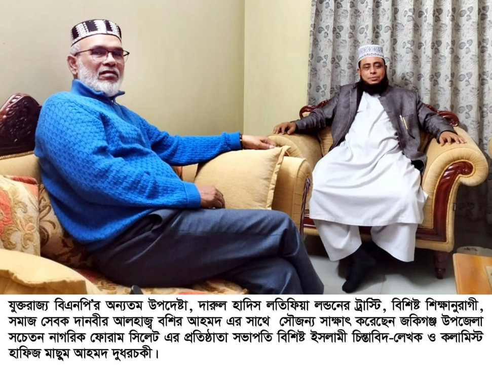 যুক্তরাজ্য বিএনপি’র অন্যতম উপদেষ্টা, দারুল হাদিস লতিফিয়া লন্ডনের ট্রাস্টি, বিশিষ্ট শিক্ষানুরাগী, সমাজ সেবক, সফল ব্যবসায়ী ও শামসুল উলমা আল্লামা ফুলতলী ছাহেব কিবলা (রহ:)’র স্নেহভাজন ও আমার শ্রদ্ধাভাজন ব্যক্তি দানবীর আলহাজ্ব বশির আহমদ এর সাথে সৌজন্য সাক্ষাৎ করেছেন জকিগঞ্জ উপজেলা সচেতন নাগরিক ফোরাম সিলেট এর প্রতিষ্ঠাতা সভাপতি বিশিষ্ট ইসলামী চিন্তাবিদ-লেখক ও কলামিস্ট হাফিজ মাছুম আহমদ দুধরচকী। ১০ ডিসেম্বর বুধবার দুপুরে এই সৌজন্য সাক্ষাৎ অনুষ্ঠিত হয়। এ সময় হাফিজ মাছুম আহমদ দুধরচকী দানবীর আলহাজ্ব বশির আহমদ সাহেবের সাথে মতবিনিময় করেন। বশির আহমদ জানান, তিনি মানবসেবা ও মসজিদ-মাদ্রাসার উন্নয়নের তার সহযোগিতা অব্যাহত রয়েছে। তিনি বলেন, তার এই সেবা কার্যক্রম অব্যাহত থাকবে ইনশাআল্লাহ। হাফিজ মাছুম আহমদ দুধরচকী দানবীর আলহাজ্ব বশির আহমদ এর সেবামূলক কাজের প্রশংসা করে মহান আল্লাহর দরবারে সুস্বাস্থ্য ও দীর্ঘায়ু কামনা করেন। উল্লেখ্য, সুনামগঞ্জের আমরিয়া গ্রামের সম্ভ্রান্ত মুসলিম পরিবারের সন্তান দানবীর আলহাজ্ব বশির আহমদ মানুষ সেবা করে যাচ্ছেন। শুধু মানব সেবা ছাড়াও সমাজের বিভিন্ন ক্ষেত্রে অবদান আছে। তিনি লন্ডন ও বাংলাদেশে বিভিন্ন মসজিদ, মাদ্রাসা, রাস্তা-ঘাট, কালবার্ট, ব্রিজ ও গরিব মানুষকে সাহায্য সবসময় করে যাচ্ছেন। তার অবদান শুধু সুনামগঞ্জে সীমাবদ্ধ নয় সারা বাংলাদেশে ছড়িয়ে পড়েছে। দানবীর আলহাজ্ব বশির আহমদ সিলেটের একজন সফল ব্যবসায়ী, দেশের সীমানা ছাড়িয়ে যুক্তরাজ্যেও তার ব্যবসা বিস্তৃত।