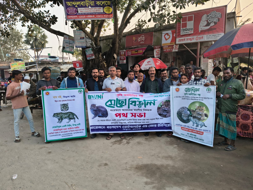 আজ ১১/১২/ ২৫ তারিখ রোজ বৃহস্পতিবার বেলা ৩:৩০ ঘটিকায় চুয়াডাঙ্গা জেলার চুয়াডাঙ্গা সদর উপজেলার গড়াইটুপি ইউনিয়ানের সড়াবাড়িয়া বাজারে মেছো বিড়াল সংরক্ষণে বাংলাদেশ ওয়াইল্ড লাইফ এন্ড নেচার ইনিশিয়েটিভ এর উদ্যোগে এক পথ সভার আয়োজন করা হয়েছে। মেছো বিড়াল সংরক্ষণে আমাদের করনীয় বিষয়ক পথ সভায় প্রধান অতিথি হিসাবে উপস্থিত ছিলেন ফাতরুজ্জামান , প্রধান শিক্ষক, সড়াবাড়িয়া মাধ্যমিক বিদ্যালয়। বিশেষ অতিথি হিসাবে উপস্থিত ছিলেন প্রকৌশলী মনিরুজ্জামান, প্রভাষক, জীবননগর সরকারি টেকনিক্যাল স্কুল এন্ড কলেজ। অনুষ্ঠানে সভাপতিত্বে ছিলেন বড় সলুয়া নিউ মডেল ডিগ্রি কলেজ এর প্রাণিবিদ্যার প্রভাষক ও বাংলাদেশ ওয়াইল্ড লাইফ এন্ড নেচার ইনিশিয়েটিভ এর সভাপতি মো: আহসান হাবীব শিপলু। অনুষ্ঠানে প্রধান অতিথি বলেন বাংলাদেশের আর্থ সামাজিক প্রেক্ষাপটে বন্যপ্রাণী মেছো বিড়ালের গুরুত্ব অপরিসীম। মেছো বিড়াল খাদ্য শৃঙ্খলেও ব্যাপক ভূমিকা পালন করে। তাই আসুন মেছো বিড়াল সংরক্ষণে এগিয়ে আসি। বিশেষ অতিথি বলেন আল্লাহতালা প্রত্যেকটি প্রাণী মানুষের মঙ্গলের জন্য সৃষ্টি করেছেন। তাই মেছো বিড়ালও অনুরূপ একটি উপকারী প্রাণী। তাই আসুন অহেতুক মেছো বিড়ালকে হত্যা করবো না ও আইন মান্য করার চেষ্টা করব। অনুষ্ঠানে সভাপতি বলেন একটি মেছো বিড়াল তার ১০ বছর জীবন কালে একটি ফসলের মাঠে কৃষকের প্রায় ৫০ লক্ষ টাকার ক্ষতির হাত থেকে ফসল রক্ষা করে। তাছাড়া বন্য প্রাণী সংরক্ষণ ও নিরাপত্তা আইন ২০১২ অনুযায়ী মেছো বিড়াল সংরক্ষিত প্রাণী। মেসো বিড়াল হত্যা আটক ক্রয় বিক্রয় একটি দণ্ডনীয় অপরাধ এই অপরাধে সাজা এক লক্ষ টাকা জরিমান ও দুই বছরের জেল। তাই আমরা আইনের প্রতি শ্রদ্ধা রেখে সকলে মিলে মেছো বিড়াল সংরক্ষণে কাজ করব। এই সময় সংগঠনের বায়জিদ, রিয়াজুদ্দিন, নীরব, ইয়াছিন, মিশাল, ফারদিন সহ এলাকার গণ্যমান্য ব্যক্তিবর্গ। উপস্থিত সকলে এই ব্যতিক্রমী পথ সভার ভূয়সী প্রশংসা করেন ও এরকম প্রচারণা মেছো বিড়াল সংরক্ষণে গুরুত্বপূর্ণ ভূমিকা পালন করবে বলে সুধীমহল মনে করেন