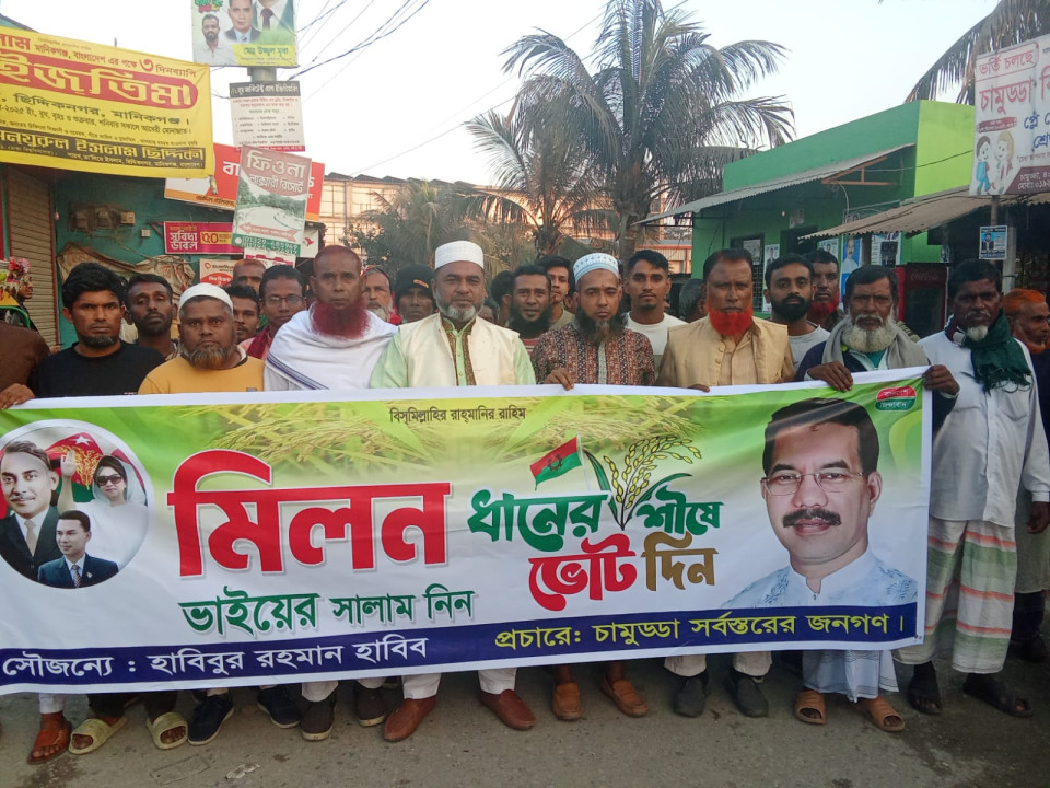 পক্ষে বৃহস্পতিবার (১১ ই ডিসেম্বর ২০২৫ ইং) বিকালে চামুড্ডা বাজার এলাকায় জননেতা একেএম ফজলুল হক মিলনকে আগামী সংসদ নির্বাচনে ধানের শীষ প্রতীকে বিপুল ভোটে বিজয়ী করতে আনন্দ মিছিল ও লিফলেট বিতরণ করেন বিএনপি নেতা হাবিবুর রহমান হাবিব, আবুল বাশার দেওয়ান, মান্নান মিয়া, আনিসুর রহমান, আনোয়ার হোসেন ভূঁইয়া সহ আরো অসংখ্য নেতা কর্মী।বিএনপি নেতা হাবিবুর রহমান বলেন আসন্ন জাতীয় সংসদ নির্বাচনে গাজীপুর জেলা বিএনপির আহবায়ক ও গাজীপুর পাঁচ আসনের সংসদ সদস্য পদপ্রার্থী জননন্দিত জননেতা জনাব এ কে এম ফজলুল হক মিলন কে ধানের শীষ প্রতীকে ভোট দেওয়ার আহ্বান জানিয়ে বলেন,“আগামী নির্বাচন হবে গণতন্ত্র পুনরুদ্ধারের লড়াই। জনগণ যদি ধানের শীষে ভোট দেয়, তবে আমরা জনগণের সরকার প্রতিষ্ঠা করে দেশে ন্যায়বিচার ও উন্নয়নের নতুন দিগন্ত উন্মোচন করবো।” লিফলেট বিতরণের মাধ্যমে এলাকাবাসীর মধ্যে বিএনপি’র ঘোষিত কর্মসূচি প্রচার করা হয়।