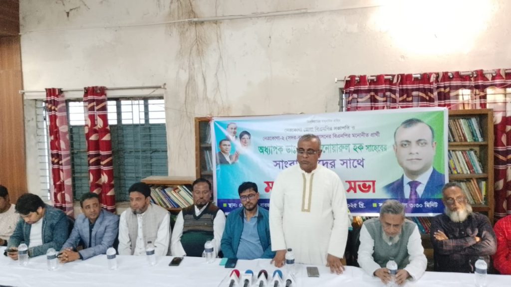 আমি চেষ্টা করেছি নেত্রকোনা-২ আসন সহ সারা নেত্রকোনা জেলার নেতাকর্মীদের পাশে থাকার জন্য।আমি ফ্যাসিস্ট বিরোধী সকল রাজনৈতিক কার্যক্রমে সরাসরি অংশ নিয়েছি।আমি নেতাকর্মীদের জেলে খোঁজ খবর নেওয়ার চেষ্টা করেছি।আমাকে নেত্রকোনা-২ আসন থেকে ধানের শীষের নমিনি করা হয়েছে।মানুষ ভুলের উর্ধ্বে নয়।মানুষ মাত্রই ভুল হয়।আমি নিজের ভুল ত্রুটির বাহিরে নয়।সকল ভুল ত্রুটি ক্ষমা করে আমাকে মূল্যায়ন করবেন।আমি সবার পাশে থাকার চেষ্টা করব।আজ ১১ ডিসেম্বর বারহাট্টা প্রেসক্লাবে সাংবাদিকদের সাথে মত বিনিময় করার সময় তিনি এসব কথা বলেন।তিনি আরো বলেন আমি মেডিক্যাল কলেজে পড়ার সময়ই ছাত্রদলের রাজনীতির সাথে জড়িত ছিলাম।পরবর্তীতে সরকারি চাকরিতে যাই।২০০৮ সালে ফ্যাসিস্ট সরকার গঠন করার মাত্র ৩ দিন পরে আমাকে অজপাড়াগাঁয়ে বদলি করা হয়।আমার মেডিক্যাল অফিসারদের সিভিল সার্জন করা হয়।কিন্তুু আমাকে অবহেলা করা হয়।তাই আমি সরকারি চাকরিটা আর করিনি।আমি ২০১৪ সাল থেকে জেলা বিএনপির রাজনীতির সাথে জড়িত। আমি নেত্রকোনা জেলার মানুষের পাশে আছি,পরেও থাকব।এসময় তিনি ফ্যাসিস্ট আমলে সাংবাদিকদের নানান হয়রানি মূলক আইনের বিষয় তুলে ধরেণ।নেত্রকোনা জেলার সাংবাদিকদেরা ব্যক্তি স্বাধীনতায় যেকোন নিউজ করাতে পারবে বলোও আশ্বাস দেন। এসময় আরো উপস্থিত ছিলেন উপজেলা বিএনপির সিনিয়র সহ সভাপতি আক্কাস আলী, উপজেলা বিএনপির সহ সভাপতি আরিফুল্লাহ সোহেল,উপজেলা বিএনপির সাধারণ সম্পাদক আশিক আহমেদ কমল, উপজেলা বিএনপির সাবেক যুগ্ম আহ্বায়ক ও সাবেক উপজেলা চেয়ারম্যান মানিক আজাদ, জেলা ছাত্রদলের সভাপতি অনিক মাহবুব চৌধুরী, বারহাট্টা প্রেসক্লাবের সভাপতি শামস উদ্দিন আহমেদ বাবুল, প্রেসক্লাবের সাধারণ সম্পাদক আজিজুল হক ফারুক সহ বারহাট্টা প্রেসক্লাবের সকল সাংবাদিকবৃন্দ,উপজেলা বিএনপির নেতাকর্মীরা সহ প্রমুখ।