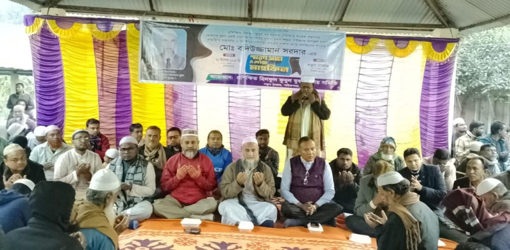 পাইকগাছায় ভোলানাথ সুখদা সুন্দরী মাধ্যমিক বিদ্যালয়ের প্রধান শিক্ষক ও পাইকগাছার ঐতিহ্যবাহী নতুন বাজার প্রশিক্ষিত হিলফুল ফুযুল যুব সমবায় সমিতির সাবেক সভাপতি মোঃ বদিউজ্জামান সরদারের স্মরণে স্মরণ সভা ও দোয়া মাহফিল অনুষ্ঠিত হয়েছে। সোমবার(২২ ডিসেম্বর) বিকালে গদাইপুর ইউনিয়নের নতুন বাজার চান্নি চত্বরে প্রশিক্ষিত হিলফুল ফুযুল যুব সমবায় সমিতির আয়োজনে এ স্মরণ সভা ও দোয়া মাহফিল অনুষ্ঠিত হয়। অনুষ্ঠানে সভাপতিত্ব করেন ফসিয়ার রহমান মহিলা কলেজের সহকারী অধ্যাপক শহিদুল ইসলাম। স্মরণ সভায় উপস্থিত ছিলেন খুলনা সরকারি পাইনিয়ার মহিলা কলেজের সহযোগী অধ্যাপক শামীম আজাদ লিটু, বিএনপি নেতা শেখ বেনজির আহমেদ লাল, সরদার ফারুক আহমেদ, আবু সালেহ মোহা ইকবাল, শিক্ষক আনিছুর রহমান, শিক্ষক বাবর আলী গোলদার এবং গদাইপুর ইউনিয়ন জামায়াতের আমির আব্দুল মজিদ সরদার। প্রশিক্ষিত হিলফুল ফুযুল যুব সমবায় সমিতির সভাপতি ইউনুস আলী সরদার ও সাধারণ সম্পাদক শামছুজ্জামানের সার্বিক তত্ত্বাবধানে অনুষ্ঠানে আরও উপস্থিত ছিলেন সিনিয়র সাংবাদিক জিএম মিজানুর রহমান, বাজার ব্যবসায়ী সমিতির সভাপতি অশোক কুমার ঘোষ, শিক্ষক কামাল আহমেদ মিল্টন, নুর আলী মোড়ল, মোঃ খালিদ হোসেন, প্রধান শিক্ষক শিব শংকর রায়, শিক্ষক জিএম সেলিম রেজা, মুস্তাফিজুর রহমান লিপ্টন, মোকলেছুর রহমান কাজল, সাবেক ইউপি সদস্য জগন্নাথ দেবনাথ, ডিএম হারুন রশিদ, শিক্ষার্থী মুবাশশীর বিন শহীদসহ উপজেলা ও ইউনিয়নের বিভিন্ন শ্রেণি-পেশার মানুষ। বক্তারা তাদের বক্তব্যে মরহুম মোঃ বদিউজ্জামান সরদারের কর্মজীবন, শিক্ষা ক্ষেত্রে অবদান এবং সামাজিক কর্মকাণ্ডের স্মৃতিচারণ করেন। পরে মরহুমের রুহের মাগফিরাত কামনায় দোয়া ও মোনাজাত অনুষ্ঠিত হয়। দোয়া অনুষ্ঠান পরিচালনা করেন মাওলানা আব্দুল হান্নান ওমর।