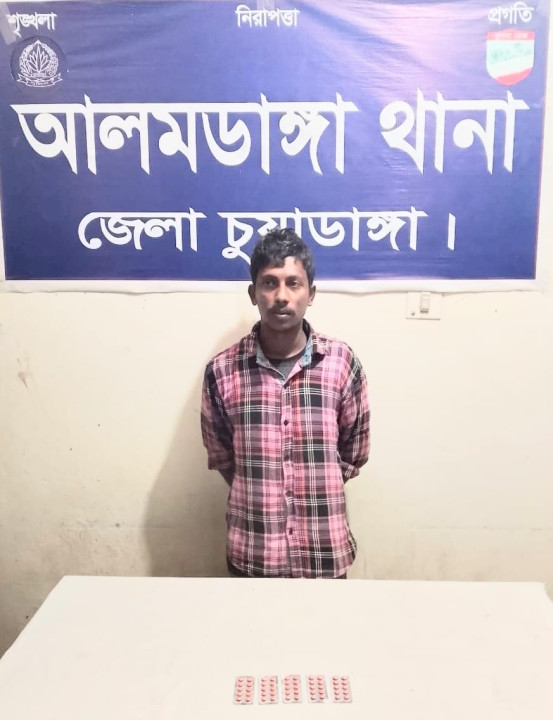 মঙ্গলবার (২৩ ডিসেম্বর) দুপুরে আলমডাঙ্গা থানার অফিসার ইনচার্জ মোঃ বানী ইসরাইলের নেতৃত্বে এসআই (নিঃ) মোঃ বাবলু খানসহ সঙ্গীয় অফিসার ফোর্স বিশেষ অভিযান পরিচালনা করেন। গোপন সংবাদের ভিত্তিতে আলমডাঙ্গা থানাধীন স্টেশনপাড়াস্থ মনোয়ার মেডিকেল সার্ভিসেসের সামনে পাকা রাস্তা থেকে মাদকসহ তাকে আটক করা হয়। গ্রেফতারকৃত ব্যক্তি গোবিন্দপুর (মাঠপাড়া) গ্রামের বাসিন্দা, পিতা মোঃ মহির উদ্দিন, আসামি মোঃ শাকিল হোসেন (২৫)। পুলিশ জানায়, বিকেল ২টা ৫০ মিনিটে অভিযানের সময় তার কাছ থেকে উদ্ধারকৃত ৫০ পিচ Tapentadol ট্যাবলেট জব্দ করা হয়। পরবর্তীতে তাকে থানা হেফাজতে নেওয়া হয় এবং আইনগত ব্যবস্থা প্রক্রিয়াধীন রয়েছে।