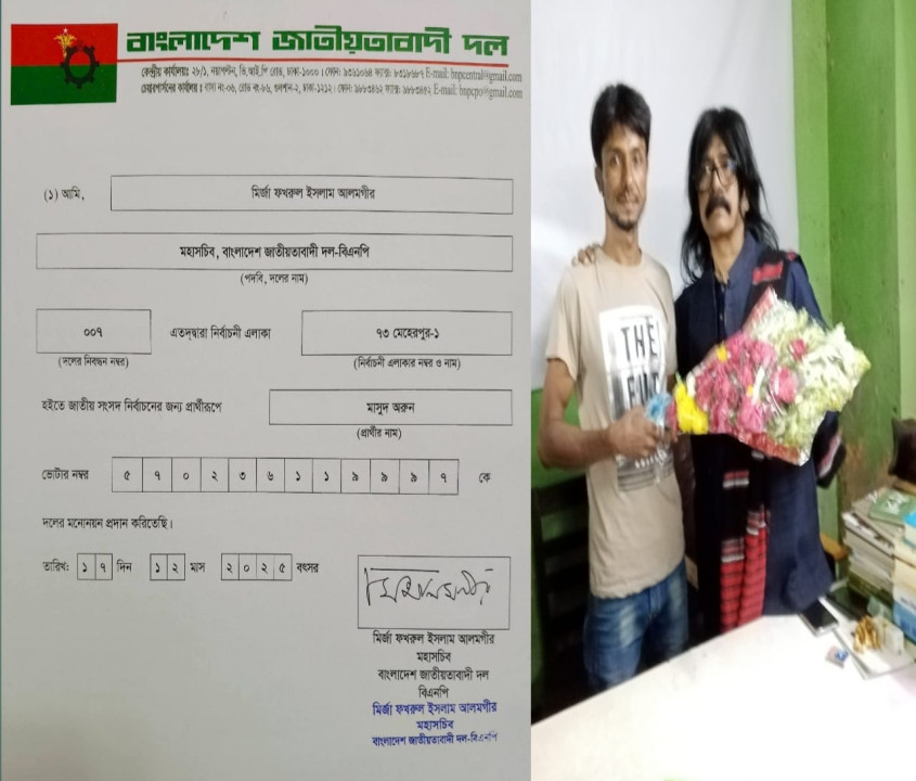 মেহেরপুর-১ আসনে বাংলাদেশ জাতীয়তাবাদী দল বিএনপি’র চূড়ান্ত মনোনয়ন পেয়েছেন সাবেক সংসদ সদস্য মাসুদ অরুণ, বুধবার ২৪ ডিসেম্বর-২০২৫ রাতে রাজধানীর গুলশানে বিএনপির চেয়ারপারসন বেগম খালেদা জিয়ার রাজনৈতিক কার্যালয় থেকে আনুষ্ঠানিকভাবে তার হাতে মনোনয়নপত্র তুলে দেওয়া হয়।