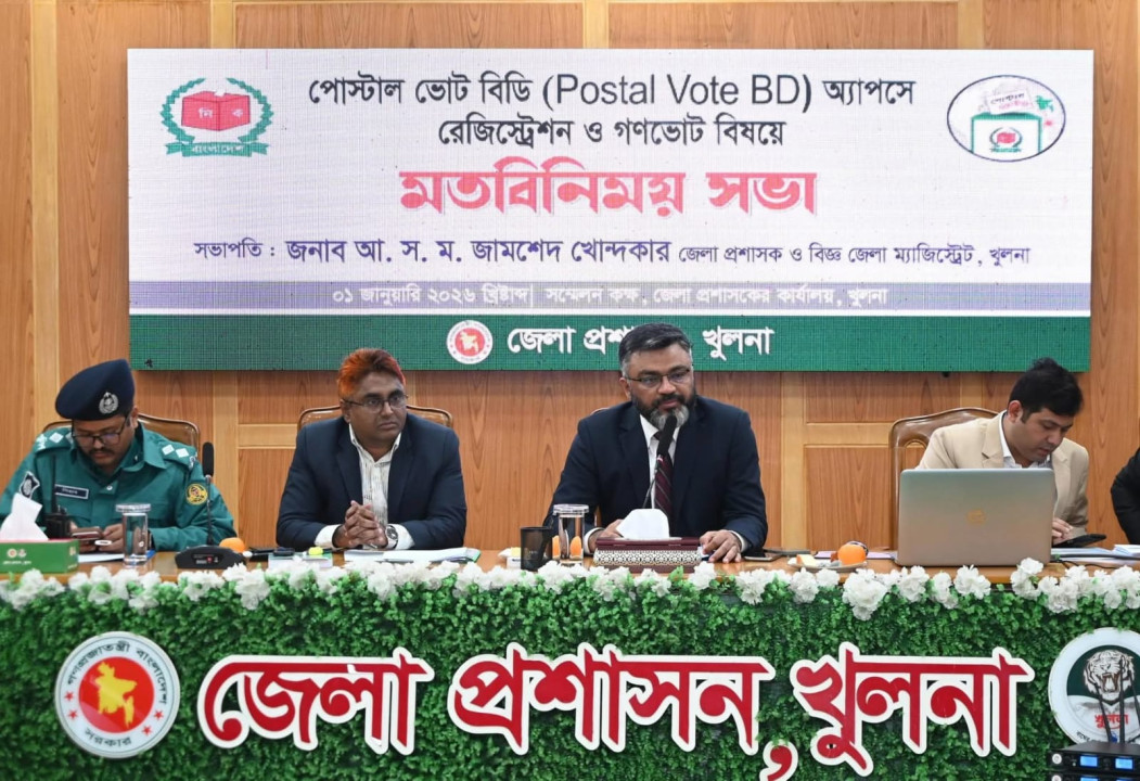 খুলনায় পোস্টাল ভোট বিডি (Postal Vote BD) অ্যাপসে রেজিস্ট্রেশন ও গণভোট বিষয়ে এক মতবিনিময় সভা অনুষ্ঠিত হয়েছে। বৃহস্পতিবার(১ জানুয়ারি) জেলা প্রশাসকের সম্মেলন কক্ষে আয়োজিত মতবিনিময় সভায় সভাপতিত্ব করেন খুলনা জেলা প্রশাসক ও বিজ্ঞ জেলা ম্যাজিস্ট্রেট আ. স. ম. জামশেদ খোন্দকার। সভায় জেলা ও উপজেলা পর্যায়ের প্রাথমিক ও মাধ্যমিক শিক্ষা অফিসারগণ এবং ইসলামী ফাউন্ডেশনের প্রতিনিধিগণ অংশগ্রহণ করেন। এ সময় পোস্টাল ভোট বিডি অ্যাপের মাধ্যমে রেজিস্ট্রেশন প্রক্রিয়া ও গণভোট সম্পর্কে বিস্তারিত আলোচনা করা হয়। এছাড়াও নিজ নিজ দপ্তরের সরকারি কর্মকর্তা-কর্মচারীদের মধ্যে এ বিষয়ে সচেতনতা বৃদ্ধির লক্ষ্যে অংশগ্রহণকারীদের প্রয়োজনীয় দিকনির্দেশনা প্রদান করা হয়। মতবিনিময় সভায় আরও উপস্থিত ছিলেন অতিরিক্ত জেলা ম্যাজিস্ট্রেট নূরুল হাই মোহাম্মদ আনাছ, সিনিয়র জেলা নির্বাচন অফিসার মোঃ সোহেল সামাদ, সহকারী পুলিশ কমিশনার (খুলনা জোন) শিহাব করিমসহ জেলা প্রশাসন খুলনার অন্যান্য কর্মকর্তাবৃন্দ।