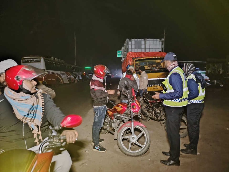 চুয়াডাঙ্গা শহরের কোর্টমোড় দোয়েল চত্বর ও দৌলতদিয়ার এলাকায় পুলিশের চেকপোস্ট বসিয়ে অভিযান পরিচালিত হয়েছে। বুধবার সন্ধ্যা সাড়ে ছয়টা থেকে শুরু হওয়া এই অভিযানে ট্রাফিক শৃঙ্খলা ও জননিরাপত্তা নিশ্চিত করতে বিভিন্ন যানবাহন তল্লাশি করা হয়। অভিযানকালে লাইসেন্স ও হেলমেটবিহীন মোটরসাইকেল, পাশাপাশি বাস, ট্রাক ও মাইক্রোবাসের বৈধ কাগজপত্র যাচাই করা হয়। একই সঙ্গে ইজিবাইকসহ বিভিন্ন যানবাহন তল্লাশি করে অবৈধ কোনো সামগ্রী আনা–নেওয়া হচ্ছে কি না, সে বিষয়েও খতিয়ে দেখা হয়। অভিযানের সময় উপস্থিত ছিলেন চুয়াডাঙ্গা সদর সার্কেলের অ্যাডিশনাল পুলিশ সুপার মোস্তাফিজুর রহমান। তিনি বলেন, জেলার বিভিন্ন গুরুত্বপূর্ণ স্থানে চেকপোস্ট বসিয়ে অভিযান চালানো হচ্ছে এবং পরবর্তী নির্দেশ না দেওয়া পর্যন্ত এ কার্যক্রম অব্যাহত থাকবে। কোর্টমোড় দোয়েল চত্বরে অভিযানে উপস্থিত ছিলেন ট্রাফিক ইন্সপেক্টর (টি আই) সারওয়ার হোসেন খান, সার্জেন্ট তানভীর আহমেদ জনি, ট্রাফিক সাব-ইন্সপেক্টর (টি এস আই) চঞ্চল হোসেন, এএসআই তরিকুল ইসলামসহ চুয়াডাঙ্গা সদর থানা, পুলিশ লাইন ও সদর ফাঁড়ির সদস্যরা। দৌলতদিয়ার এলাকায় পরিচালিত অভিযানে নেতৃত্ব দেন সার্জেন্ট আশরাফুজ্জামান। এ সময় এসআই সাইফুল ইসলাম, এএসআই হারুনসহ চুয়াডাঙ্গা সদর থানা, পুলিশ লাইন ও ট্রাফিক পুলিশের সদস্যরা অংশ নেন। উভয় স্থানে চেকপোস্ট অভিযানে হেলমেটবিহীন চালনাসহ বিভিন্ন অভিযোগে পাঁচজন মোটরসাইকেল চালকের বিরুদ্ধে মোট ১৮ হাজার টাকা জরিমানা করা হয়। পুলিশ জানিয়েছে, জনস্বার্থে ও আইনশৃঙ্খলা পরিস্থিতি স্বাভাবিক রাখতে এ ধরনের অভিযান ভবিষ্যতেও চলমান থাকবে।
