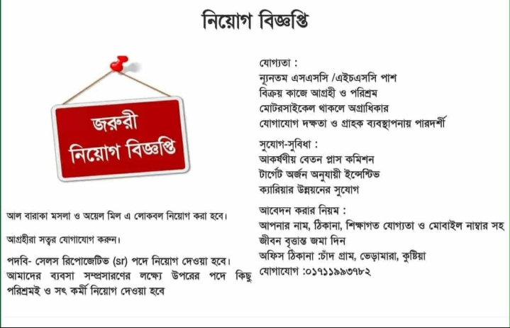 আমাদের ব্যবসা সম্প্রসারণের লক্ষ্যে উপরের পদে কিছু পরিশ্রমই ও সৎ কর্মী নিয়োগ দেওয়া হবে