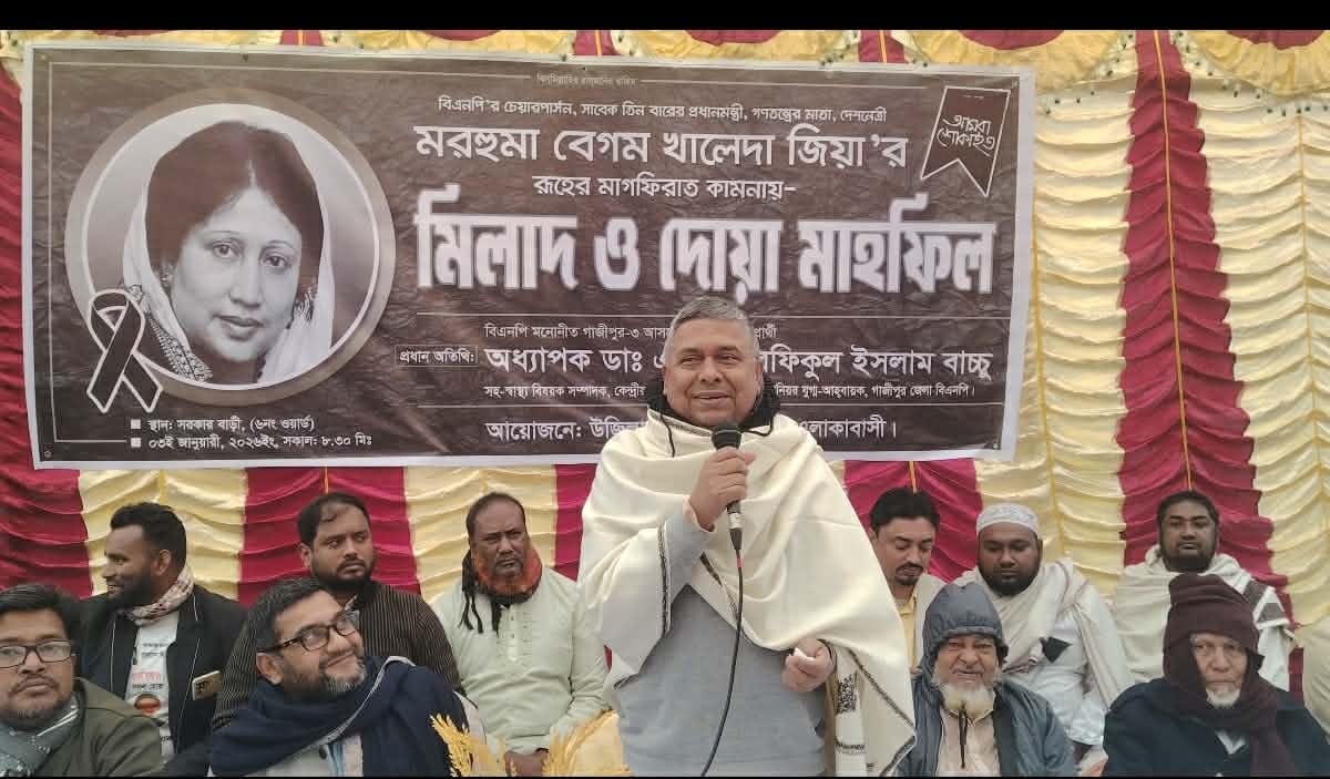 সাবেক প্রধানমন্ত্রী ও বিএনপি চেয়ারপারসন বেগম খালেদা জিয়ার কর্মময় জীবন ছিল গণতন্ত্র, মানুষের ভোটাধিকার ও ন্যায়ভিত্তিক রাষ্ট্রব্যবস্থা প্রতিষ্ঠার এক নিরবচ্ছিন্ন সংগ্রামের প্রতিচ্ছবি—এমন মন্তব্য করেছেন বিএনপির কেন্দ্রীয় নির্বাহী কমিটির সহ-স্বাস্থ্য বিষয়ক সম্পাদক ও গাজীপুর-৩ আসনের বিএনপির মনোনীত সংসদ সদস্য প্রার্থী অধ্যাপক ডা. এস এম রফিকুল ইসলাম বাচ্চু।