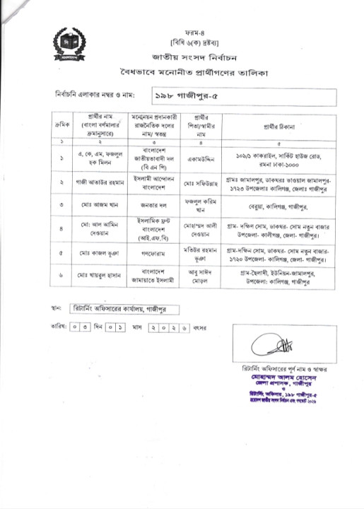 রিটার্নিং অফিসারের কার্যালয় সূত্রে জানা গেছে, শনিবার (৩ জানুয়ারী) গাজীপুর জেলা প্রশাসক ও রিটার্নিং কর্মকর্তার কার্যালয়ে সকল প্রার্থীদের উপস্থিতিতে দাখিলকৃত মনোনয়নপত্র যাচাই বাছাই করা হয়। দাখিলকৃত মনোনয়নপত্র যাচাই বাছাইয়ে বাংলাদেশ জাতীয়তাবাদী দল (বিএনপি) এর ধানের শীষ প্রতীকে মনোনীত প্রার্থী একেএম ফজলুল হক মিলন, বাংলাদেশ জামায়াতে ইসলামী মনোনীত প্রার্থী মো. খায়রুল হাসান (দাঁড়িপাল্লা), ইসলামীক ফ্রন্ট বাংলাদেশ মনোনীত প্রার্থী মো. আল-আমিন দেওয়ান (চেয়ার), জনতার দল মনোনীত প্রার্থী আজম খান (কলম), ইসলামী আন্দোলন বাংলাদেশ মনোনীত প্রার্থী গাজী আতাউর রহমান (হাত পাখা) ও গণফোরাম মনোনীত প্রার্থী মো. কাজল ভুইয়া (উদীয়মান সূর্য) এর প্রার্থীতা বৈধ ঘোষণা করা হয়।
