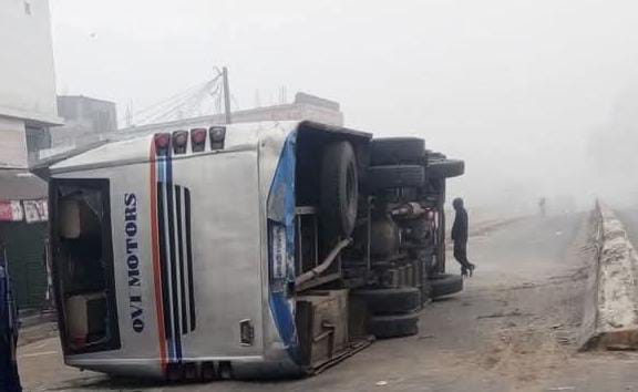 মাগুরা যশোর মহাসড়কের সীমাখালীতে হানিফ পরিবহনের বাস উল্টে গেছে। সোমবার ৫ জানুয়ারী ভোর ৫টা ৩০ মিনিটে সীমাখালী ব্রীজের রেলিং এর সাথে ধাক্কা লেগে বাসটি উল্টে যায়। তবে বাডে থাকা যাত্রীদের কোন ক্ষয়ক্ষতি হয়নি। বাসটির নম্বর ঢাকা মেট্রো-ব ১৪-৯৭৭৩ বাসটিতে ওই সময় প্রায় ২০ জনেরও বেশি যাত্রী ছিলেন। দুর্ঘটনার পরপরই স্থানীয়রা উদ্ধার কাজে এগিয়ে আসেন। প্রাথমিকভাবে জানা গেছে, এ ঘটনায় কেউ গুরুতর আহত হননি। দুর্ঘটনার সময় বাসে থাকা সকল যাত্রীই এখন নিরাপদে আছেন। দুর্ঘটনার কারণ সম্পর্কে বিস্তারিত জানা যায়নি,তবে প্রত্যক্ষদর্শীরা মনে করছেন ভোর বেলার ভারী কুয়াশা ও ড্রাইভারের চোখে ঘুম দূর্ঘটনার কারন হতে পারে।