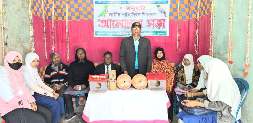 পাখি বাঁচলে প্রকৃতি বাঁচবে, প্রকৃতি বাঁচলে মানুষ বাঁচবে” এই প্রতিপাদ্যকে সামনে রেখে পাইকগাছায় জাতীয় পাখি দিবস পালিত হয়েছে। এ উপলক্ষে ৫ জানুয়ারি (সোমবার) দুপুর ১২টায় পরিবেশবাদী সংগঠন বনবিবি’র উদ্যোগে নতুন বাজারস্থ সংগঠনের কার্যালয়ে এক আলোচনা সভা অনুষ্ঠিত হয়। আলোচনা সভায় সভাপতিত্ব করেন সংগঠনের সভাপতি, সাংবাদিক ও কলামিস্ট প্রকাশ ঘোষ বিধান। অনুষ্ঠানে প্রধান অতিথি হিসেবে উপস্থিত ছিলেন অ্যাডভোকেট শফিকুল ইসলাম কচি। বিশেষ অতিথি ছিলেন প্রেসক্লাব পাইকগাছার সাধারণ সম্পাদক এম জালাল উদ্দীন এবং সমাজসেবক সাফিয়া আক্তার। সভায় আরও বক্তব্য রাখেন সুমাইয়া ফারহানা, মেরিন জান্নাত, মাহি জান্নাত, অশিয়া জান্নাত, পরিবেশকর্মী গণেশ দাস, শাহিনুর রহমানসহ অন্যান্যরা। বক্তারা বলেন, বর্তমান বিশ্বের জলবায়ু পরিবর্তনের বিরূপ প্রভাবে পাখিদের প্রাকৃতিক আবাসস্থল দিন দিন ধ্বংস হয়ে যাচ্ছে। অপরিকল্পিত বৃক্ষ নিধন এবং শিল্প-কলকারখানার সংখ্যা বৃদ্ধির ফলে পাখিদের খাদ্য সংকটও ক্রমেই তীব্র হচ্ছে। এ অবস্থায় পাখির আবাসস্থল নিরাপদ রাখা এবং তাদের বিচরণক্ষেত্র সংরক্ষণে জনসচেতনতা বৃদ্ধি অত্যন্ত জরুরি। তারা আরও বলেন, পরিবেশ সুরক্ষায় পাখির ভূমিকা অপরিসীম। পৃথিবীর প্রাকৃতিক ভারসাম্য রক্ষায় পাখি সংরক্ষণ করা একান্ত প্রয়োজন। আলোচনা সভা শেষে পাখিদের নিরাপদ আবাস নিশ্চিত করতে এলাকার বিভিন্ন গাছে মাটির পাত্র, কাঠ ও টিনের তৈরি পাখির বাসা বেঁধে দেওয়া হয়।